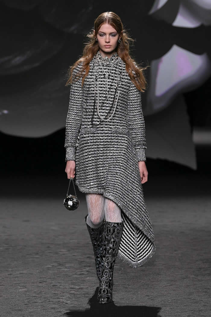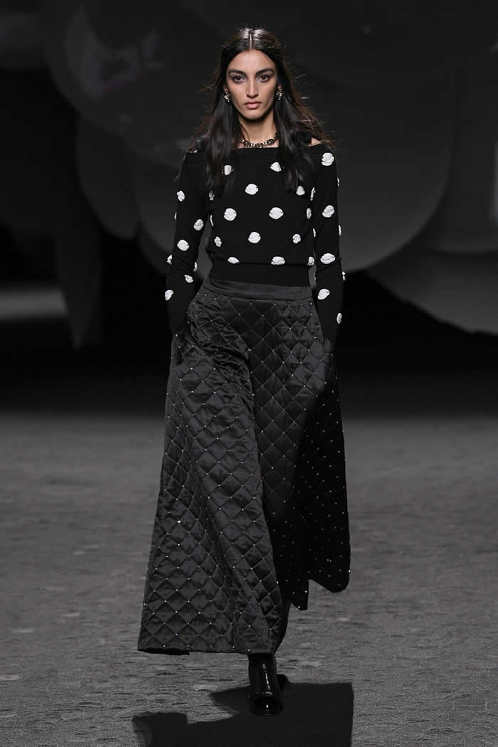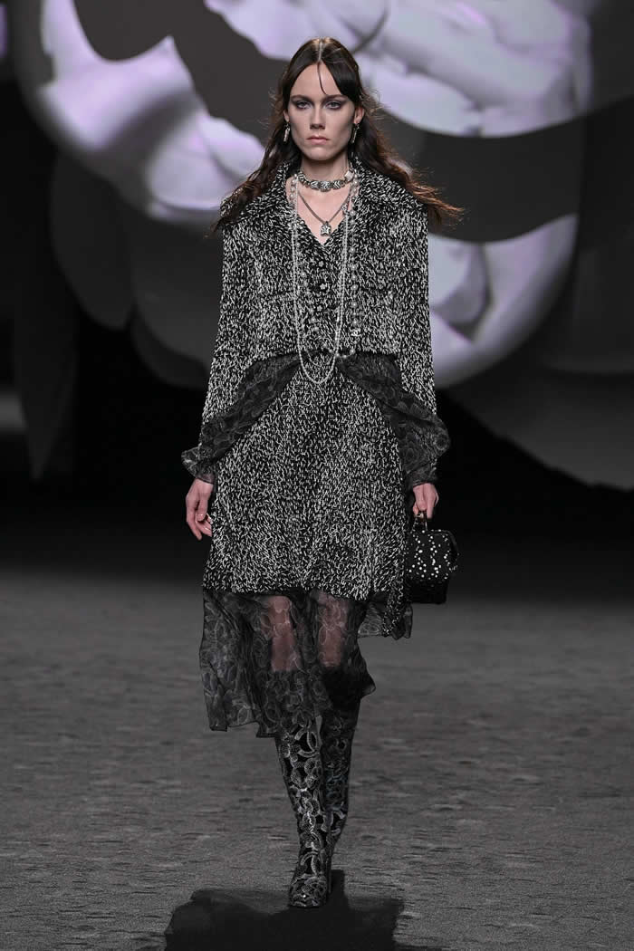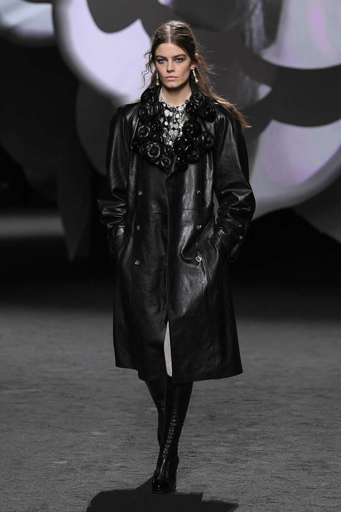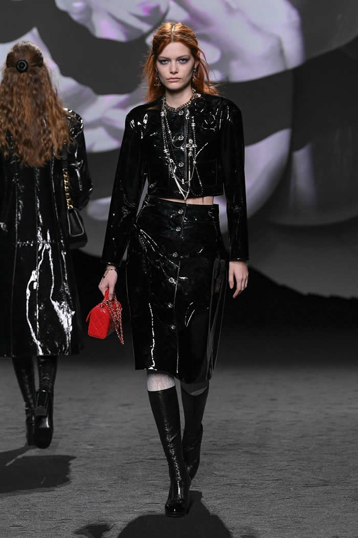 A taste for propagating a contemporary realness around Chanel’s enviable Frenchness is more Viard’s thing. Like so many others this season, she opened with variations of black, white, and gray. White camellias ran up a black trellis on a long, slim, tweed coat; they clustered as a corsage on slick black patent Mod-ish suits and popped up like polka dots all over cardigan jackets.