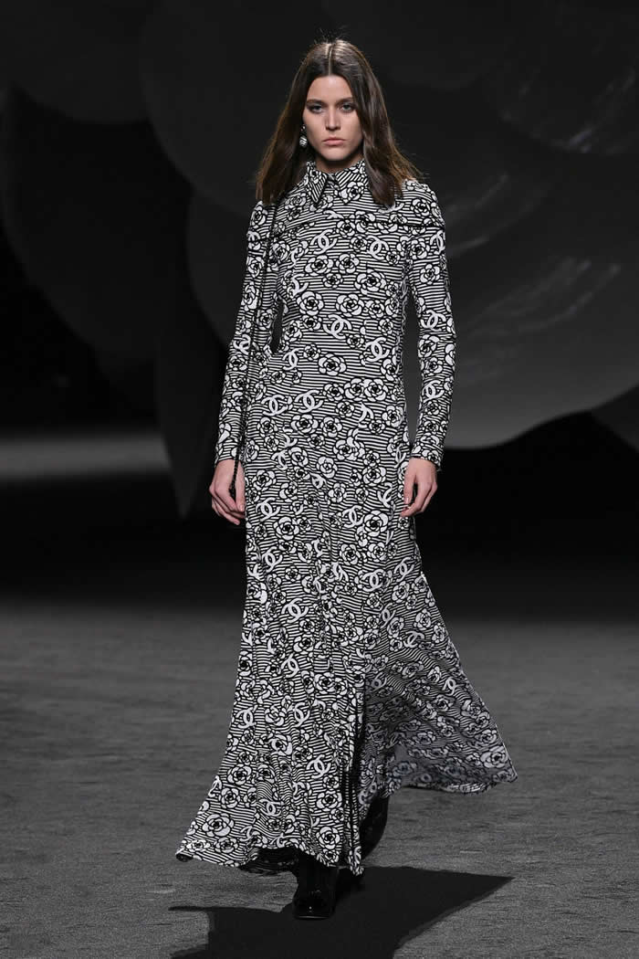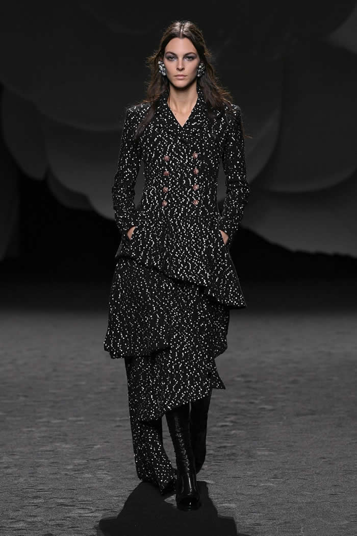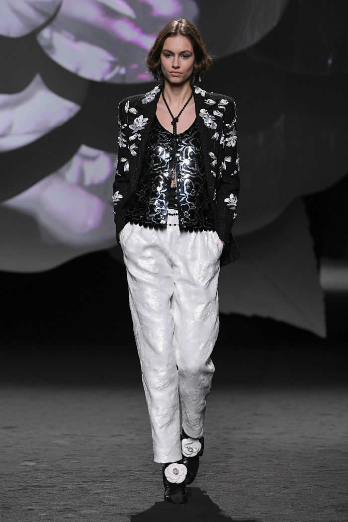 Viard had organized a giant symbolic white camellia as a set and had a real one placed on every guest’s seat, but she wasn’t pressing the anniversary angle. “The camellia is more than a theme, it’s an eternal code of the house,” she said in her press release. “I find it reassuring and familiar, I like its softness and its strength.”