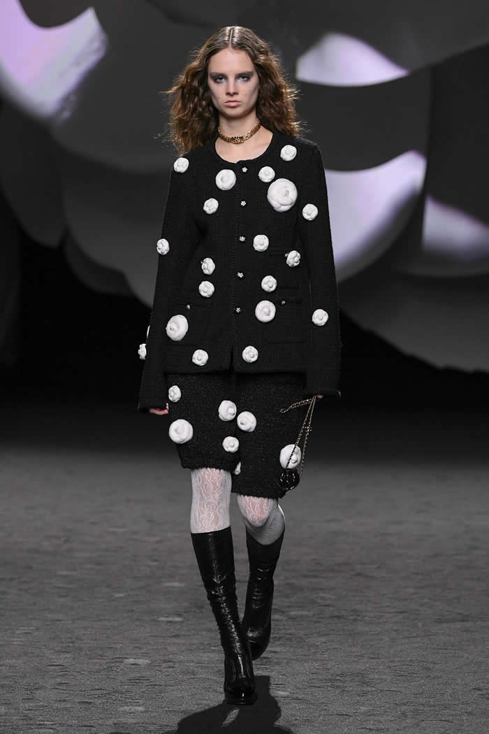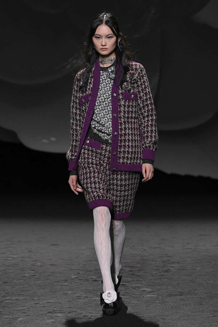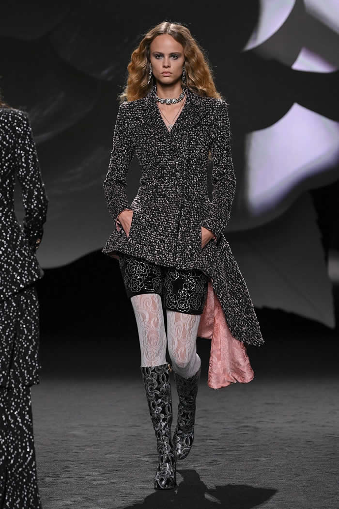 While staying within the guardrails of Chanel’s femininity and decorativeness, his former first assistant and successor have added her own dash of quirkiness to the mix. Some of the suits came paired with tweed bermudas, bloomers, or leather shorts, teamed up with white floral lace tights and knee boots.