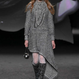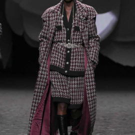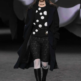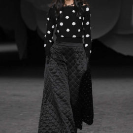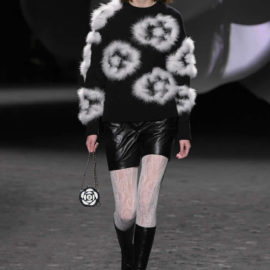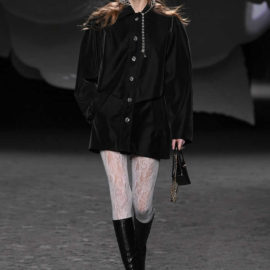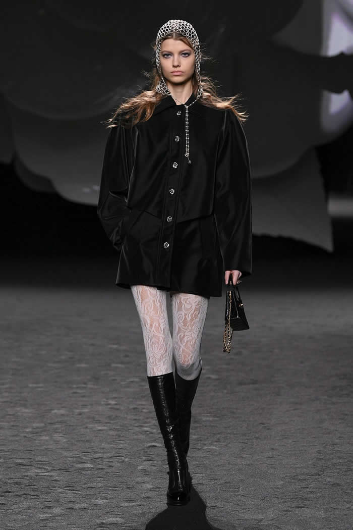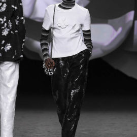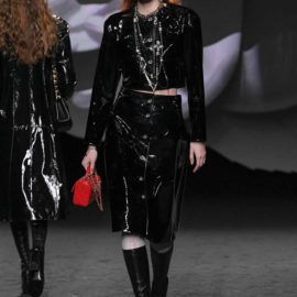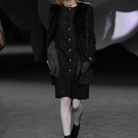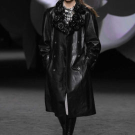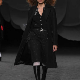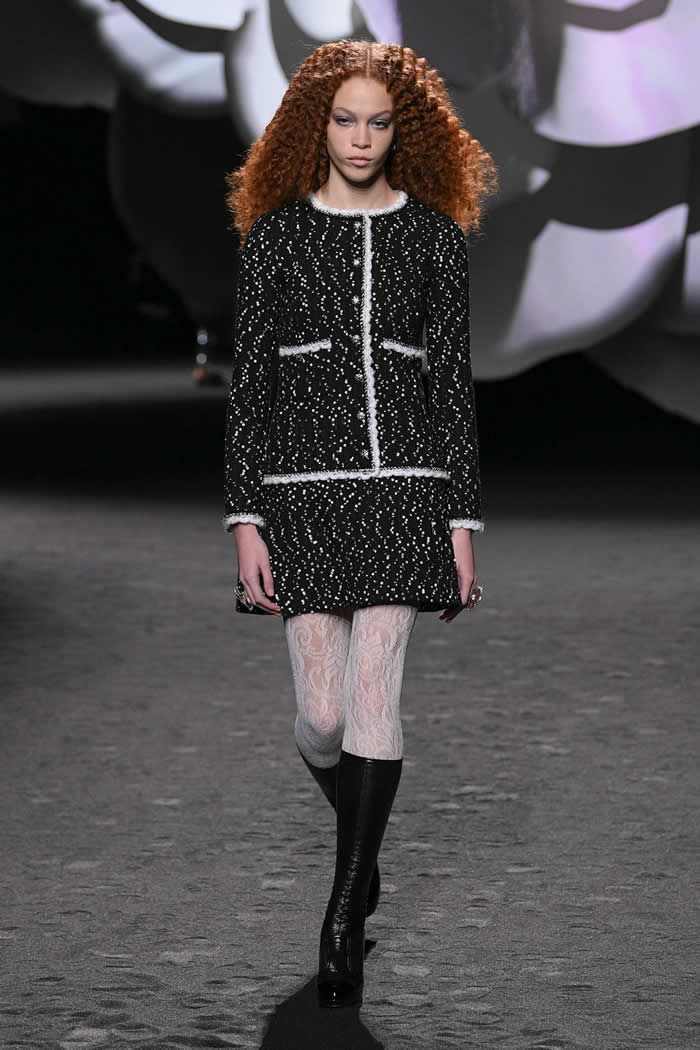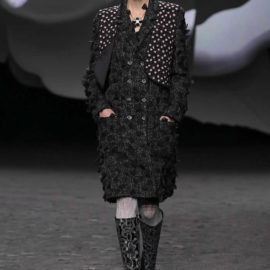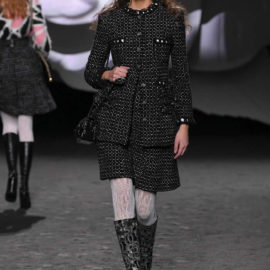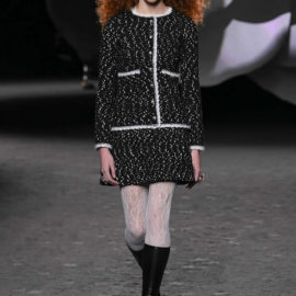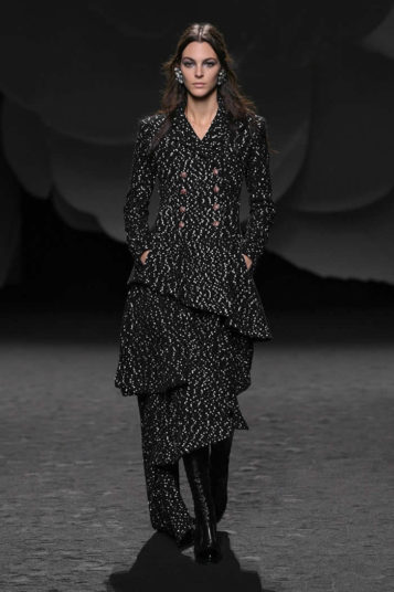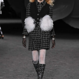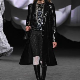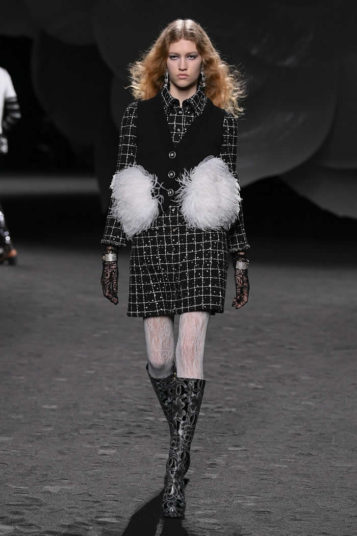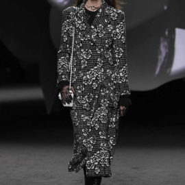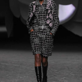 A taste for propagating a contemporary realness around Chanel’s enviable Frenchness is more Viard’s thing. Like so many others this season, she opened with variations of black, white, and gray. White camellias ran up a black trellis on a long, slim, tweed coat; they clustered as a corsage on slick black patent Mod-ish suits and popped up like polka dots all over cardigan jackets.