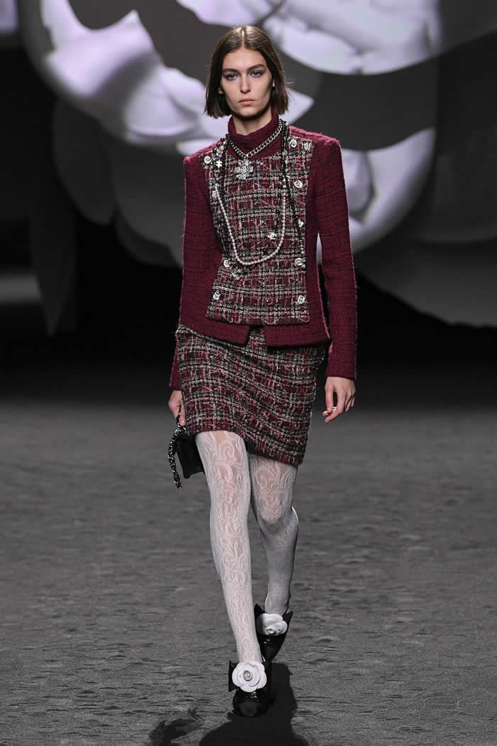 From the minutest of embroideries to the button-shapes to the big, fuzzy angora pattern on a sweater, and swinging on multiple chain bags, the flowers were absolutely everywhere. The formalities of the Chanel canon are constantly open to reinterpretation, as Karl Lagerfeld supremely taught.