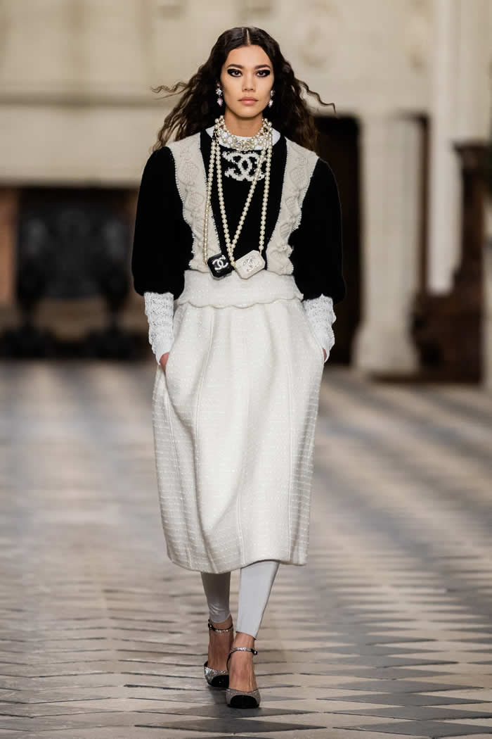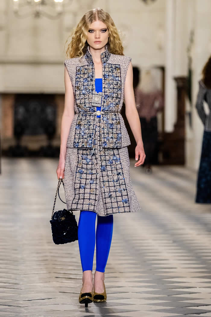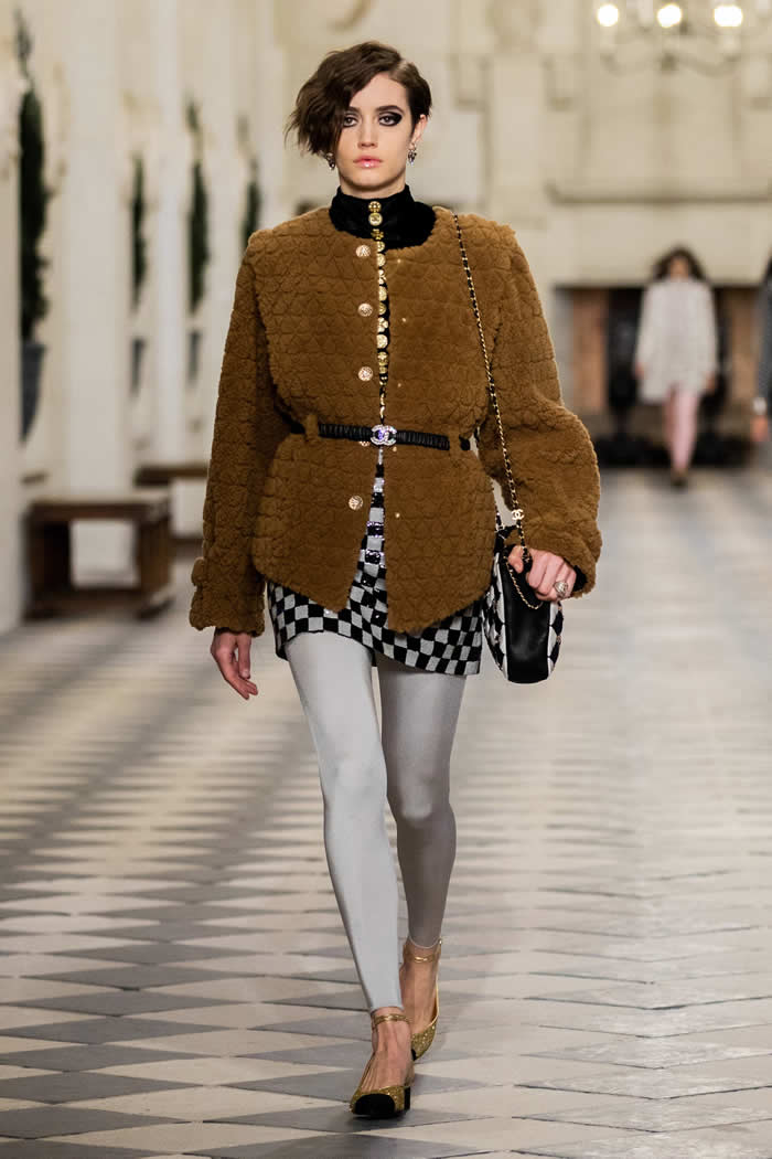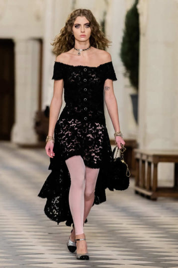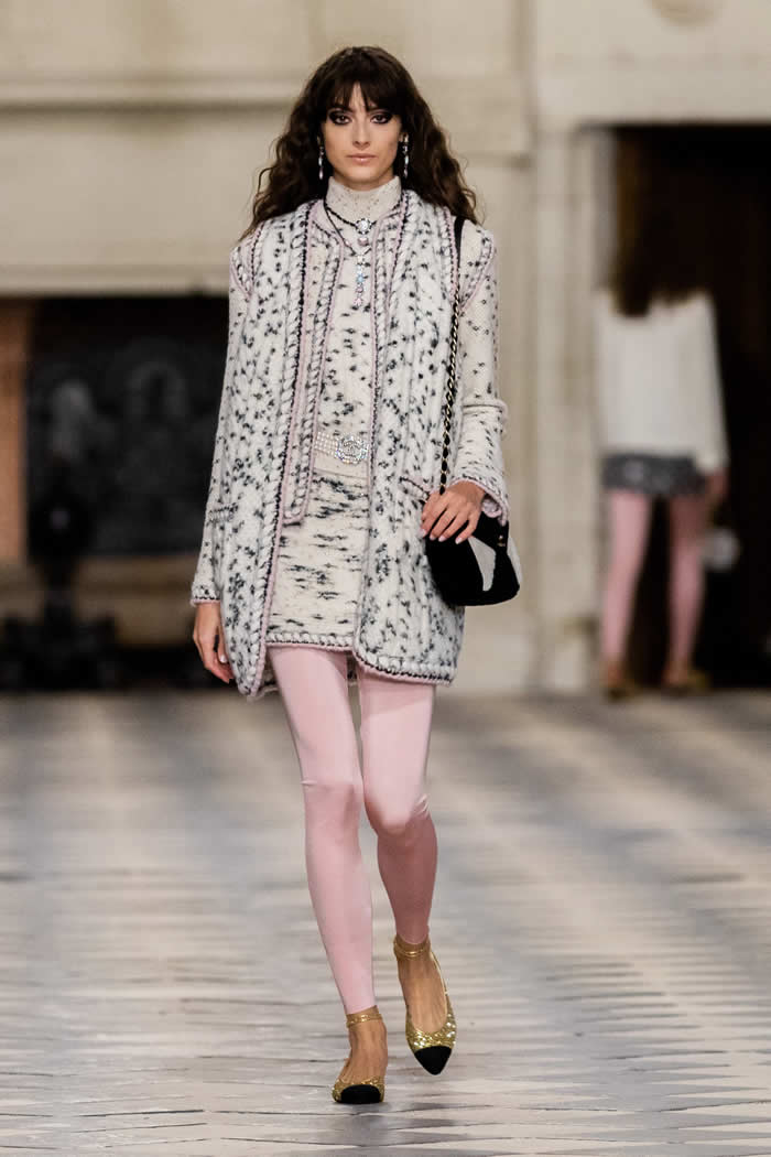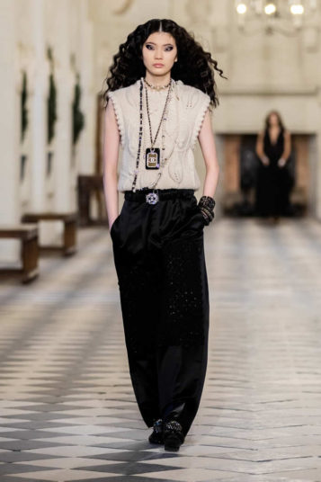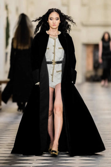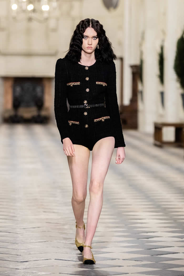 That dialogue across the centuries is also expressed in the playful drama of a floor-length black velvet coat that opens to reveal a pale tweed body, gilt buttoned like a traditional Chanel jacket. Just the thing to ward off a castle’s chills.