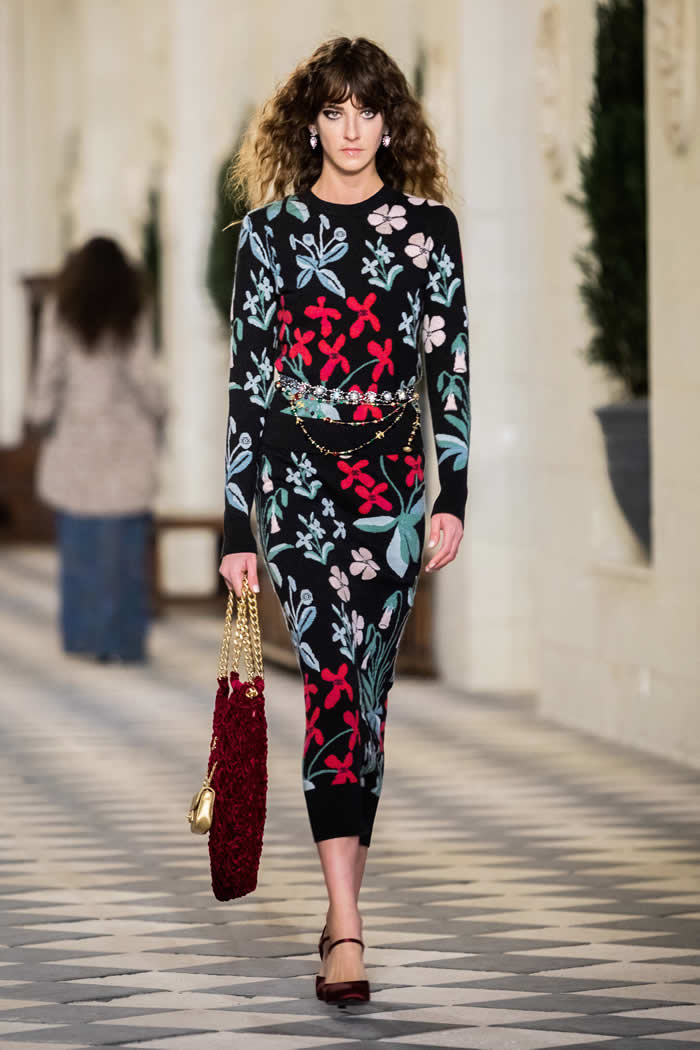 The chateau’s tapestries inspired intarsia knits and Lesage embroidered evening sweaters. Lemarie, meanwhile, famed for their feather and artificial flower work, are responsible for the trellis of black ribbons laid over translucent organza that evoke Chenonceau-era court dress with a light 2020 touch.