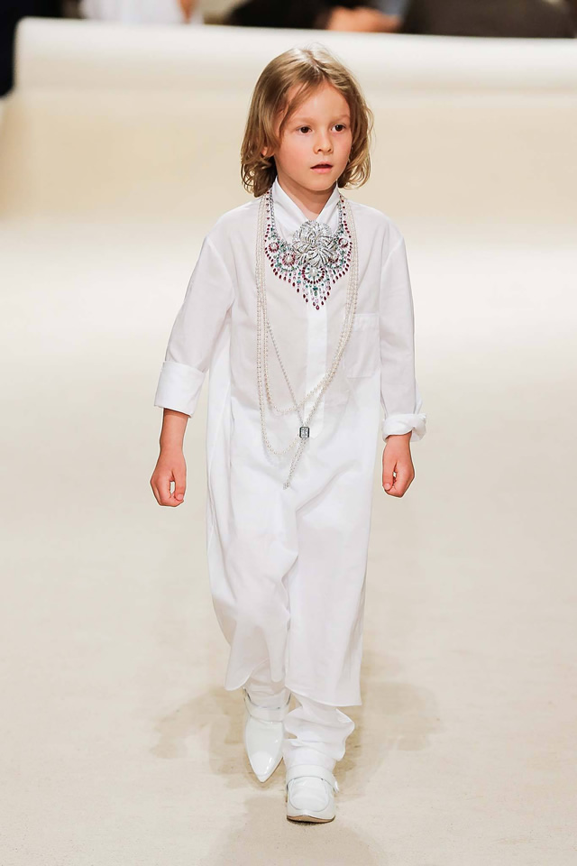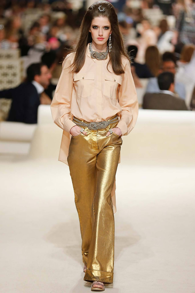 Before his arrival, a flurry of newspaper articles trumpeted the re ascendance of Dubai as a market hungry for prestige European labels. It was a temptation to track concessions to that market in this new Chanel collection. Lagerfeld toyed with the local design lingo in his use of gilding, fretwork, and the sickle-moon motif, plus an unfortunate outbreak of harem pants.