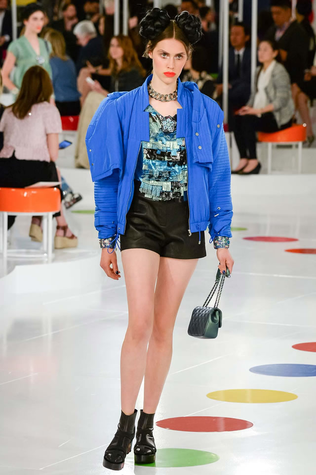 It was, in fact, this integration of the host nation into the collection that created its most special effects. Past and future knocked boots (they were actually leather stockings). The models were made up like manga kewpies, their hair concealed under big "hats" of braided black hair, a reference to Korean tonsorial tradition. The major visual motif was a busy and brightly colored patchwork, a technique, which, Lagerfeld said, is only found in Korea. The mother-of-pearl embroidery that traced a black wrap dress was inspired by the decoration on Korean wedding chests. The high empire line and flaring sleeves on full-silhouetted dresses were Lagerfeld’s sublimation of traditional garb.