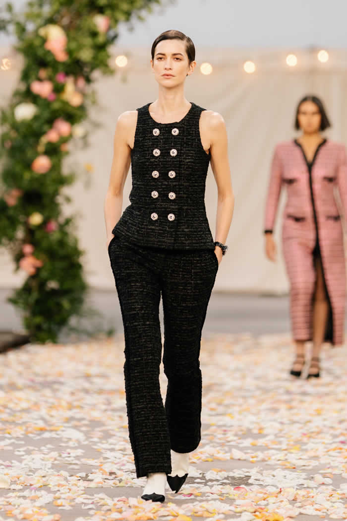 The silhouettes might be simple—sweaters or sleeveless vests worn with high-waisted pants, skinny cardigan jackets and liquid satin shirts with full romantic ballet skirts—but the beauty is in the detail. This is the haute couture, after all, and the sort of garments we may have become familiar with in our work-from-home lives have actually been encrusted with superb embroideries from the houses of Cécile Henri, Hurel, Montex, Emmanuelle Vernoux, and Lesage, or made from custom, hand-painted lace by Solstiss, or scattered with artificial blossoms by Lemarié.