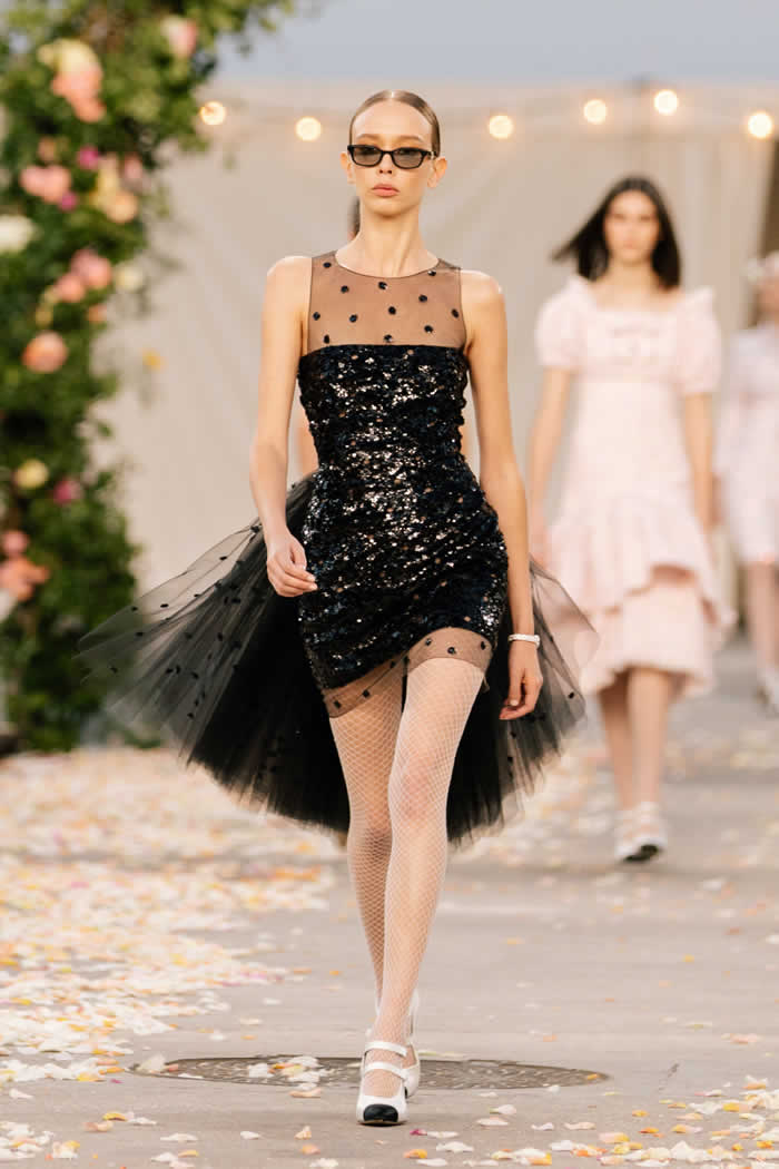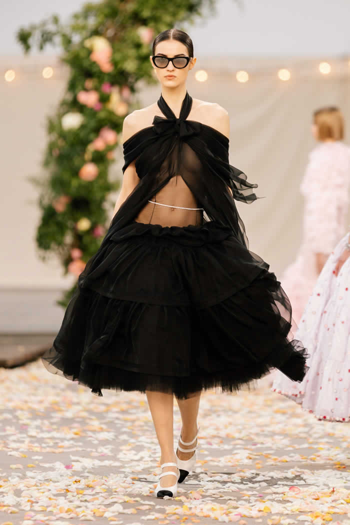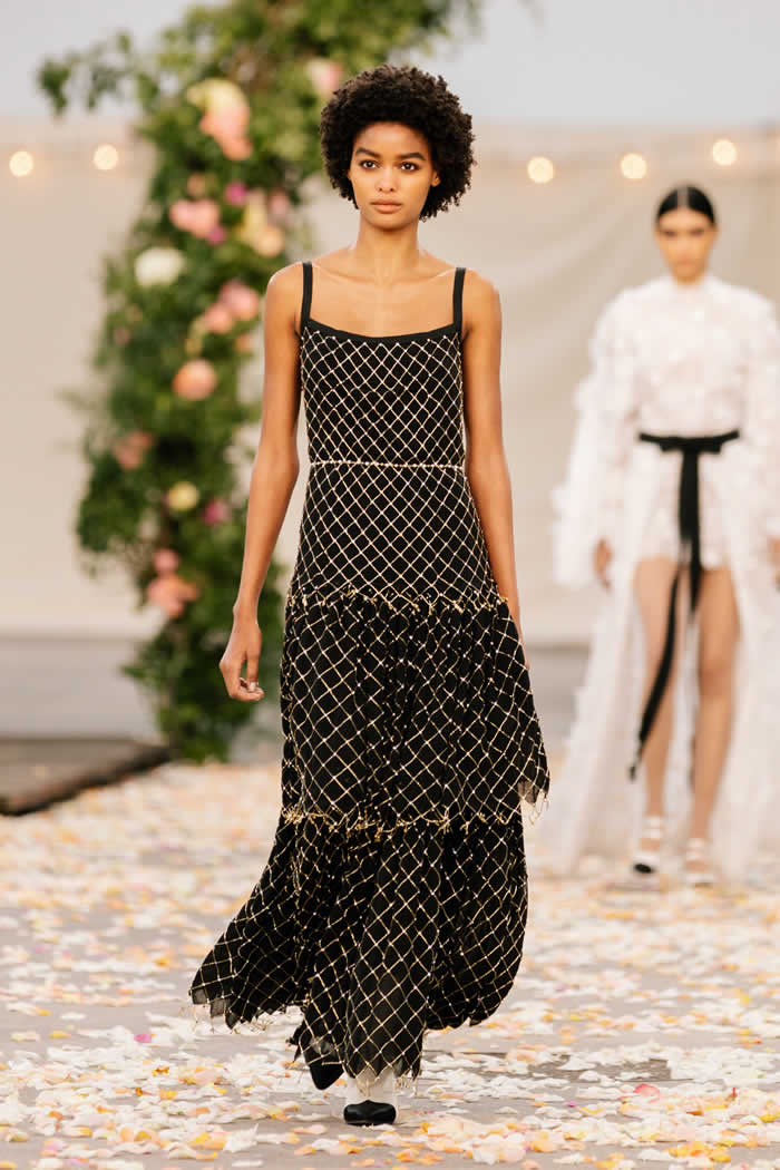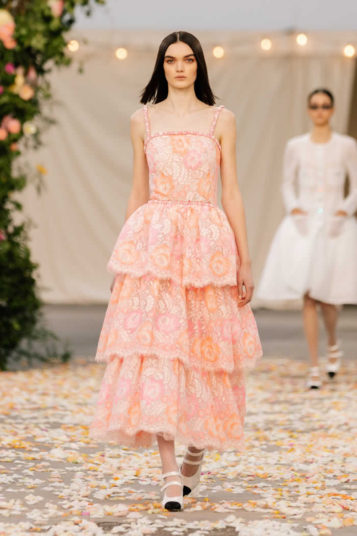 Look closely and you will see, for instance, that the full swirling hem of a flower-scattered chiffon dance dress is edged with individually cut-out and re-embroidered blossoms—a flourish with which Chanel herself used to finish some of her designs in the 1920s and ’30s, including some examples on display in the exhibition “Gabrielle Chanel: Fashion Manifesto” at Paris’s Palais Galliera (currently closed due to France’s COVID protocols).