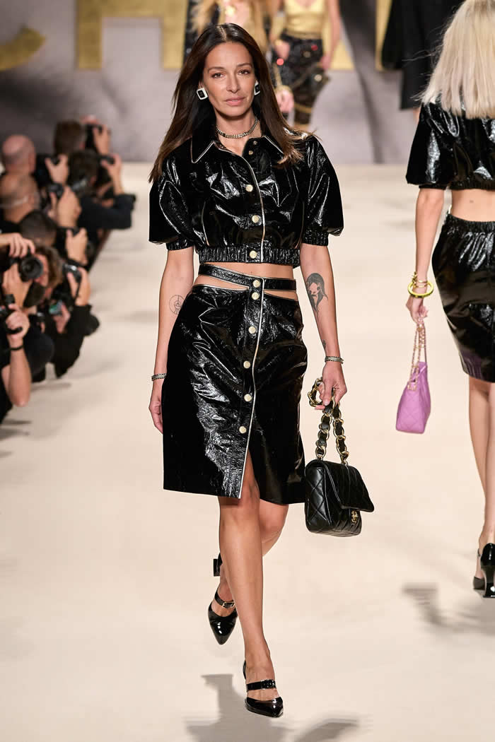 Viard offered oversized jackets in a variety of hues, including a lilac version printed with double-C logos. Miniskirts featured extended flaps in the back, while a black leather quilted dungaree had the aura of an instant classic.