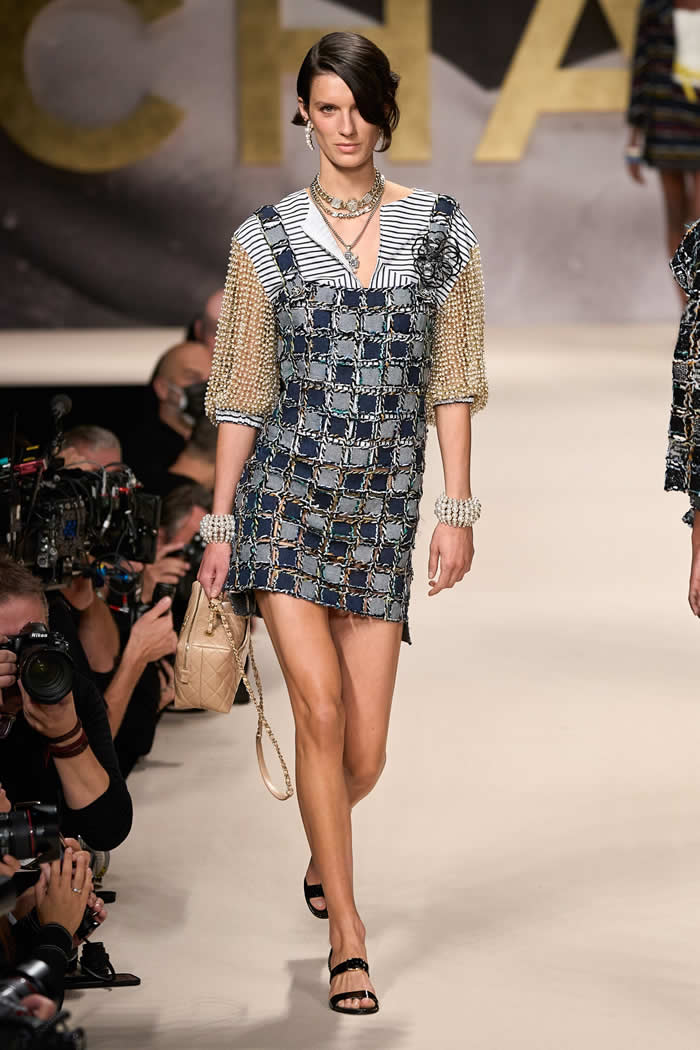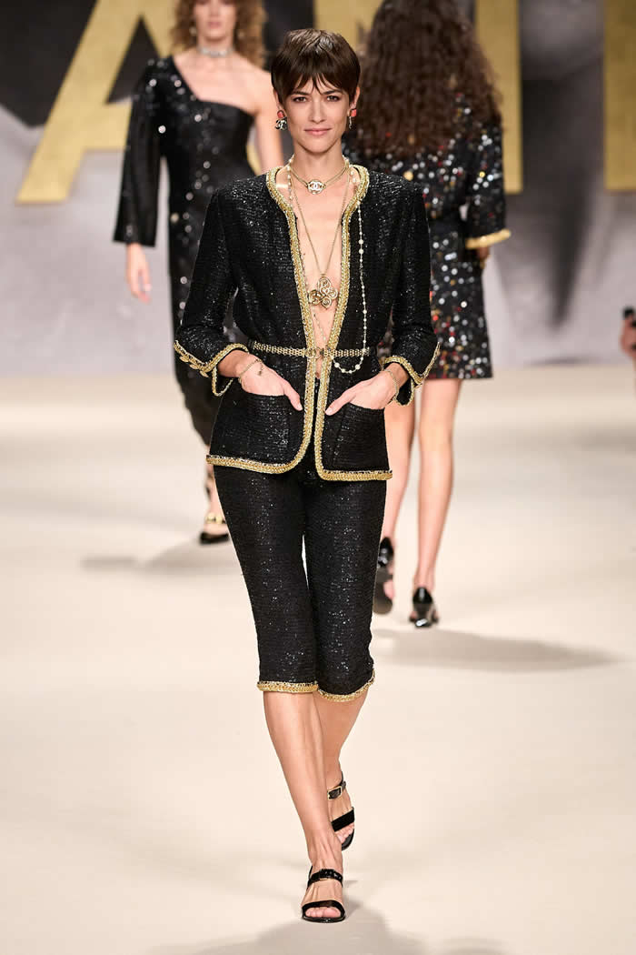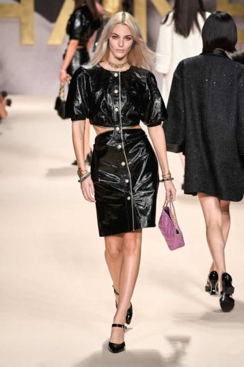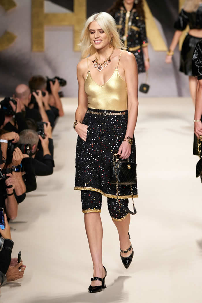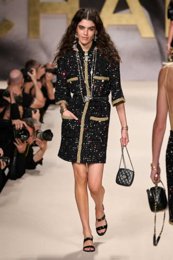 Some looks appeared teleported from that era: a cropped T-shirt with “Chanel” spelled out in sequins was paired with a long black skirt with a thong peeking over the waistband, while a pink cardigan came with a matching crop top and shorts. Handbags shaped like bottles of No. 5 perfume, which celebrates its centenary this year, are sure to generate waiting lists.