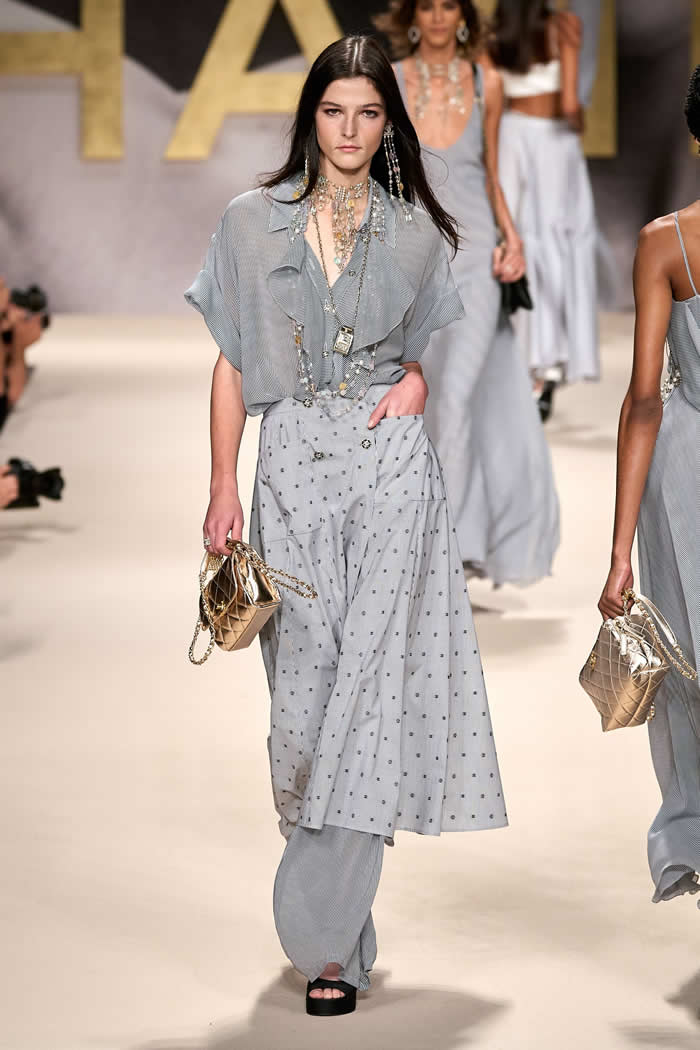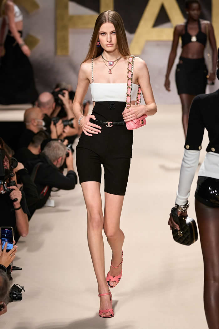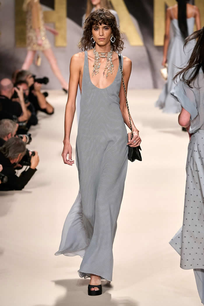 Rohner was first on the runway, in a low-cut white swimsuit and black T-shirt that were a perfect foil for the accessories: two-tone flats, a black 2.55 handbag, an oversize quilted tote and oodles of necklaces, in the kind of pileup that Lagerfeld made a trademark of ‘90s Chanel.