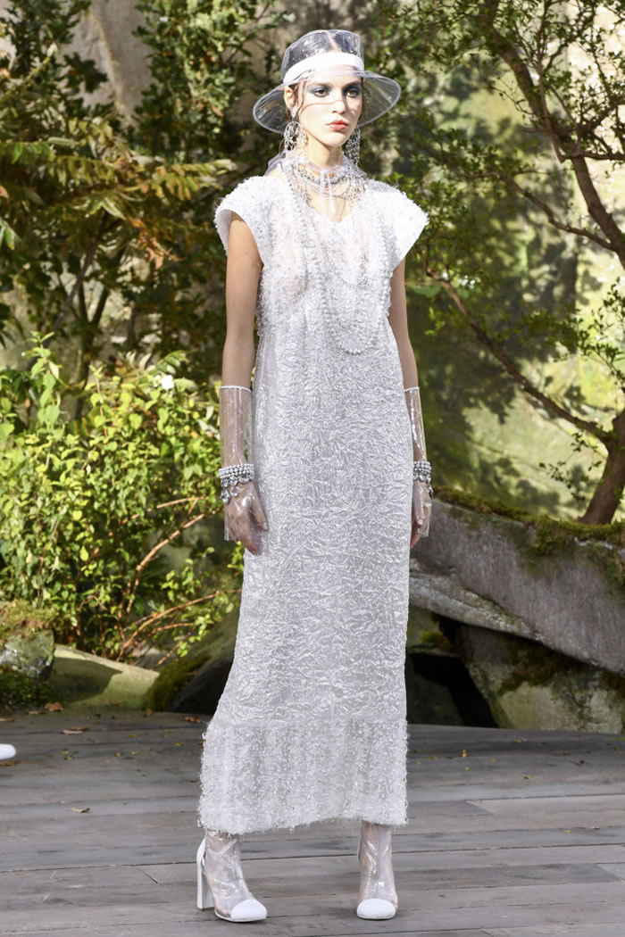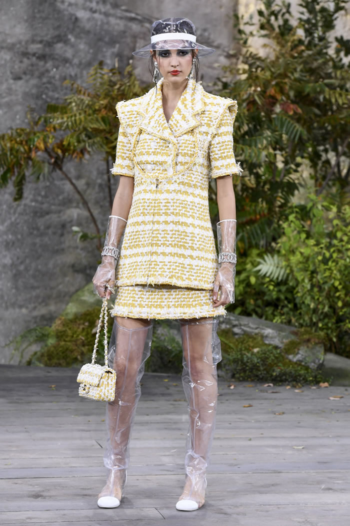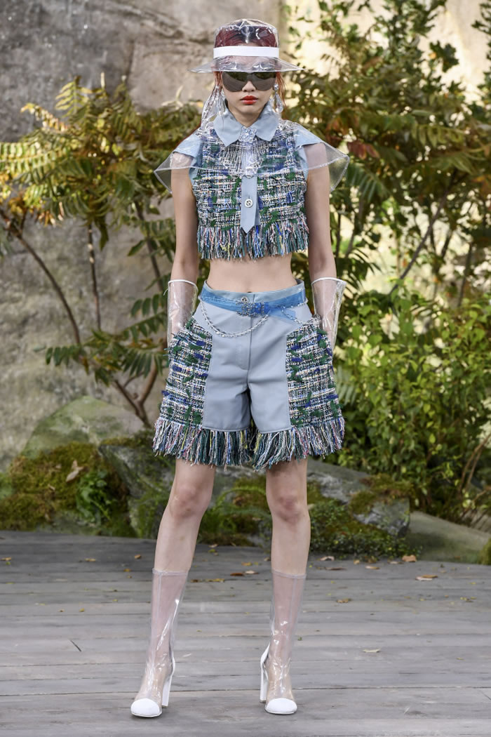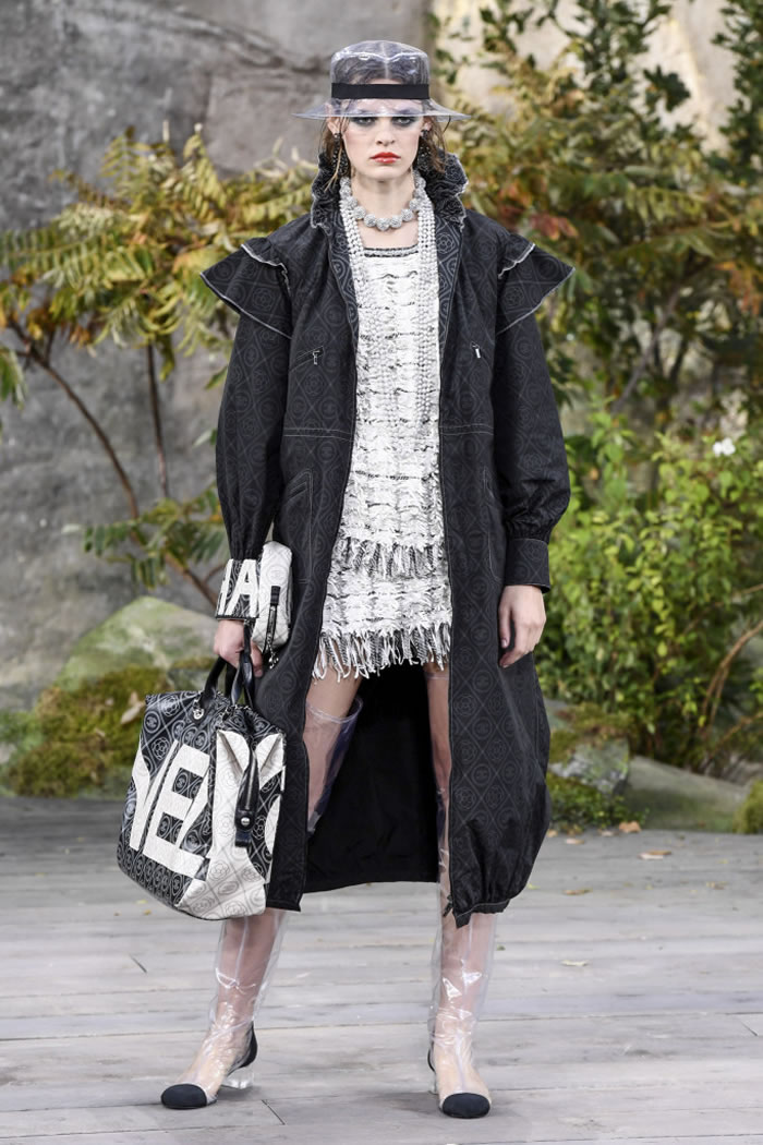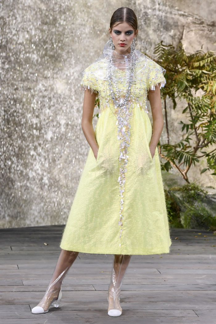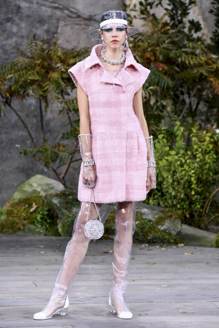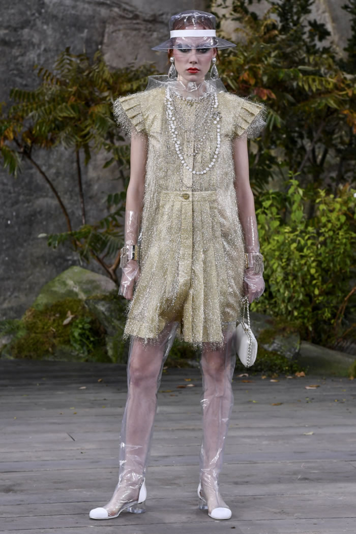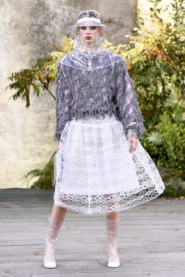 The clothes, too, were inspired by water, though not in an obvious way. Well, not obvious except for the raindrop earrings and repellent plastics for Chanel boaters, boots (many over the knee), handbags and outwear, both functional (hooded capes and anoraks) and decorative (little tippets).