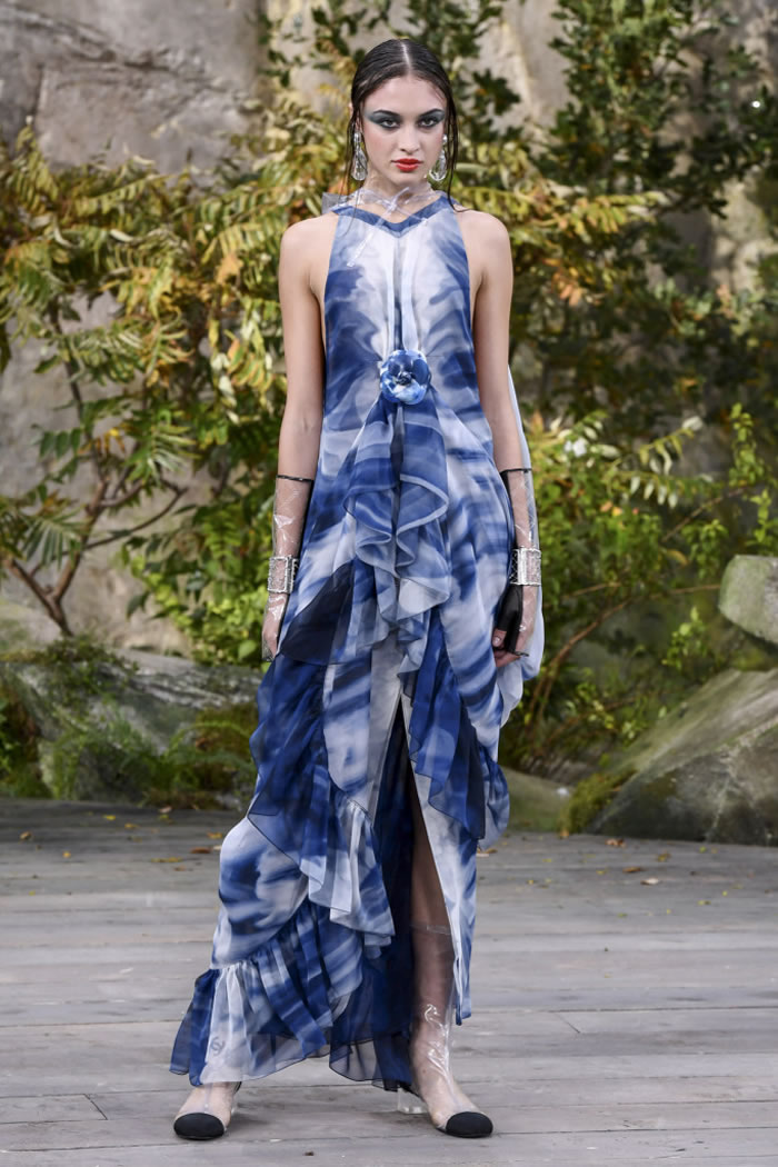 But for the most part, Lagerfeld delivered the motif via fabrics tweeds, laces, knits shot with metallic to glisten and change with movement and subtle shifts of light; sheer, open work constructions, some suggesting ripples, others, fishnet cellophane fringe; abstract watery prints; shaggy fringing that mimicked seaweed.
