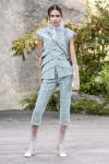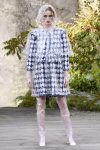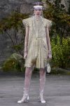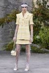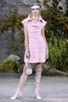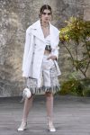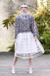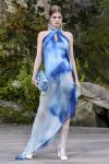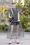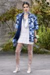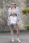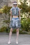 But for the most part, Lagerfeld delivered the motif via fabrics tweeds, laces, knits shot with metallic to glisten and change with movement and subtle shifts of light; sheer, open work constructions, some suggesting ripples, others, fishnet cellophane fringe; abstract watery prints; shaggy fringing that mimicked seaweed.