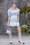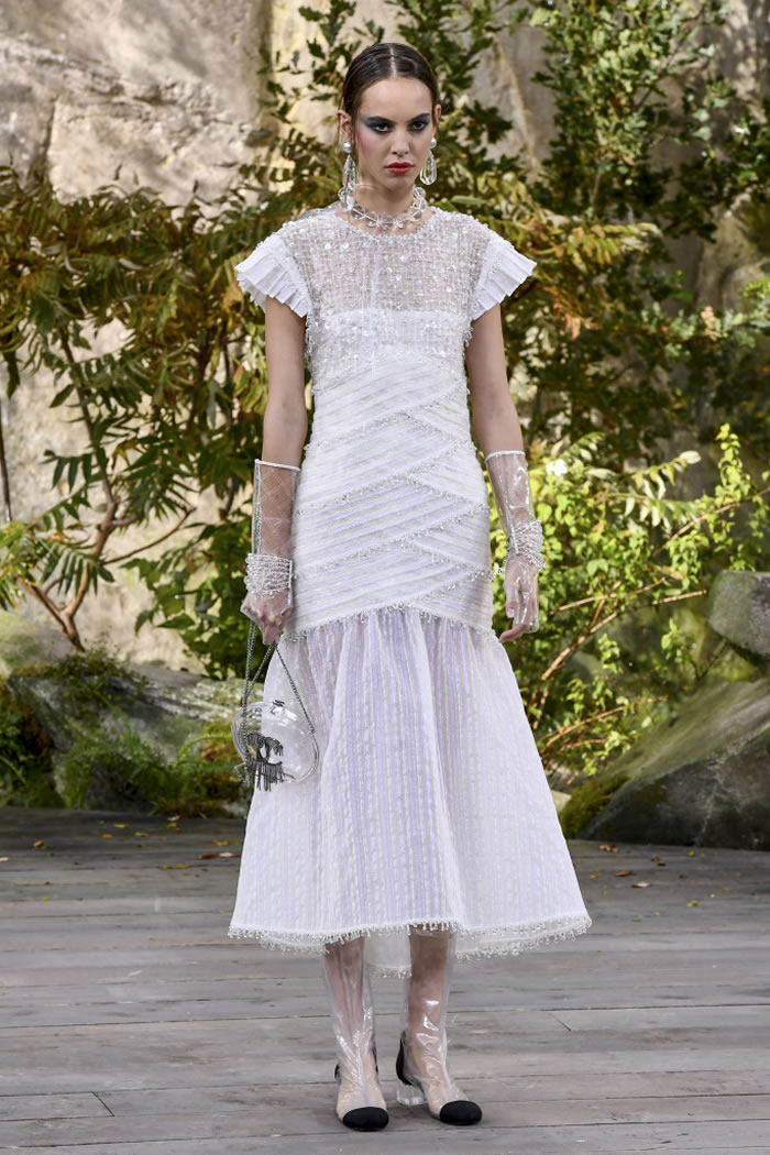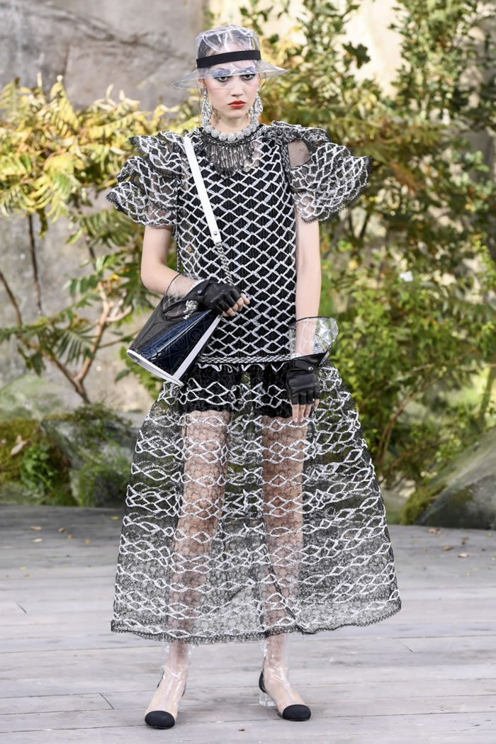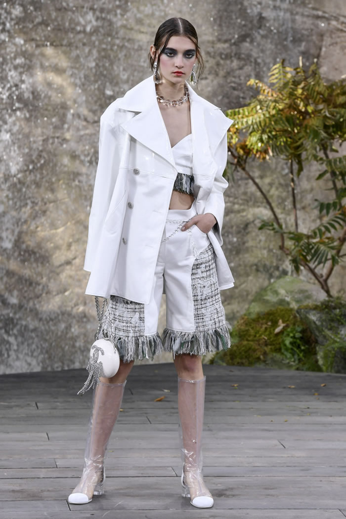 The clothes, too, were inspired by water, though not in an obvious way. Well, not obvious except for the raindrop earrings and repellent plastics for Chanel boaters, boots (many over the knee), handbags and outwear, both functional (hooded capes and anoraks) and decorative (little tippets).