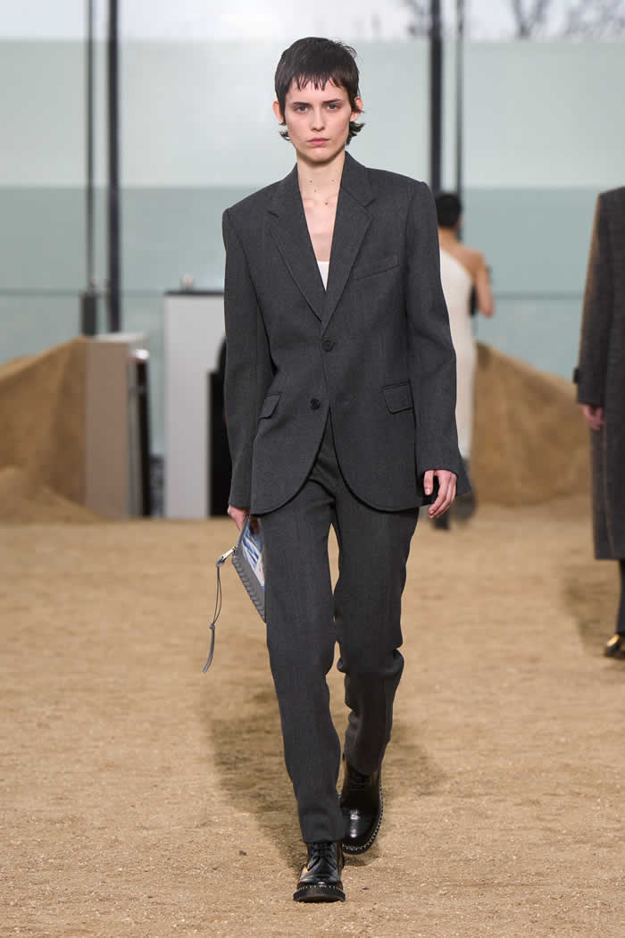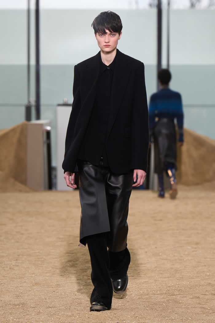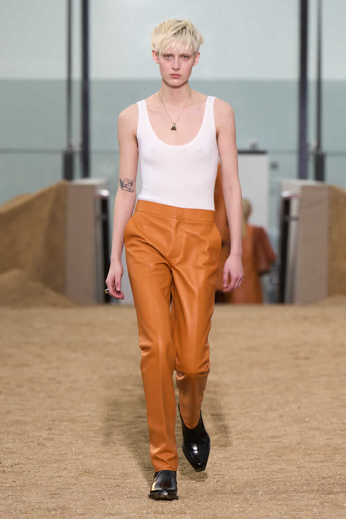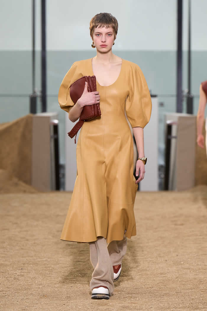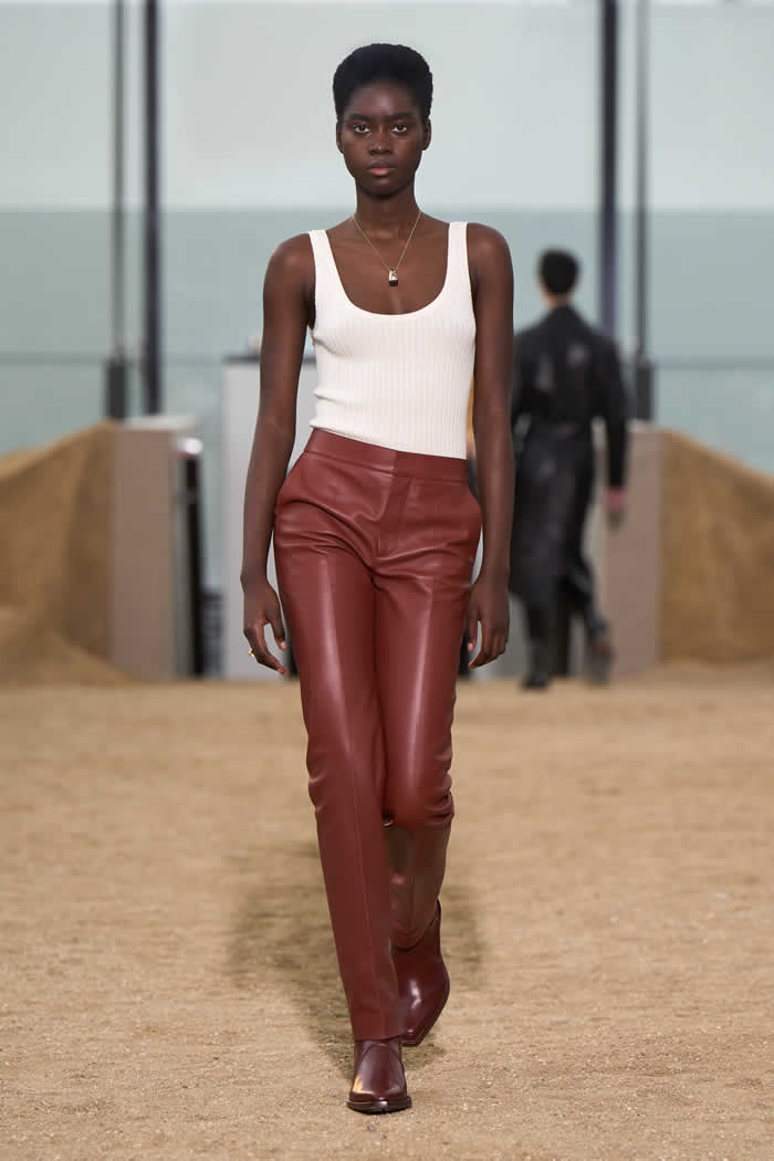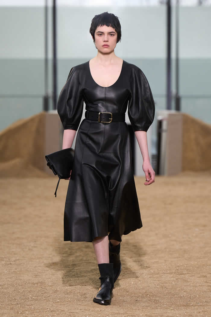 This meant that a fundamental divergence between the positions of these two climate-activist fashion designers opened up at the beginning of the show. Here there was leather. A lot of it. Not “vegan leather” or any of its fruit or mushroom substitutes, or its fossil fuel-derived polyester lookalikes (as used, variously, by McCartney), but actual glossy leather. Made from the hides of cattle.