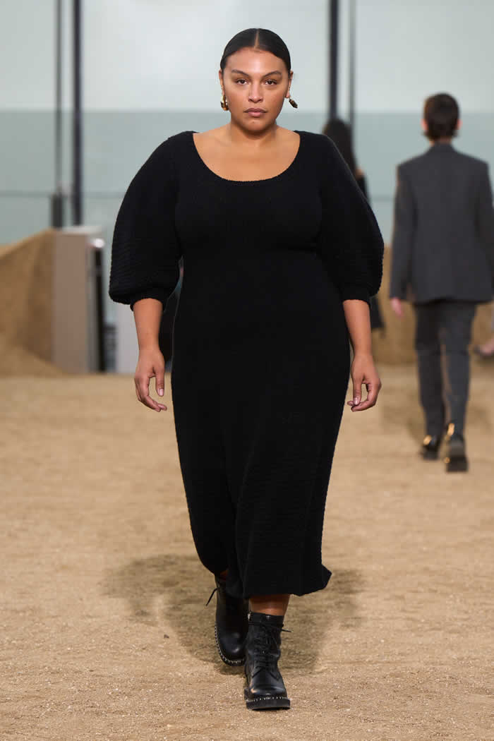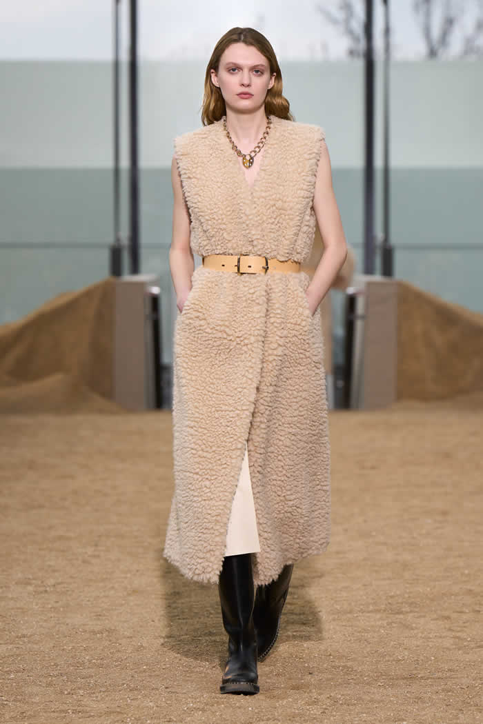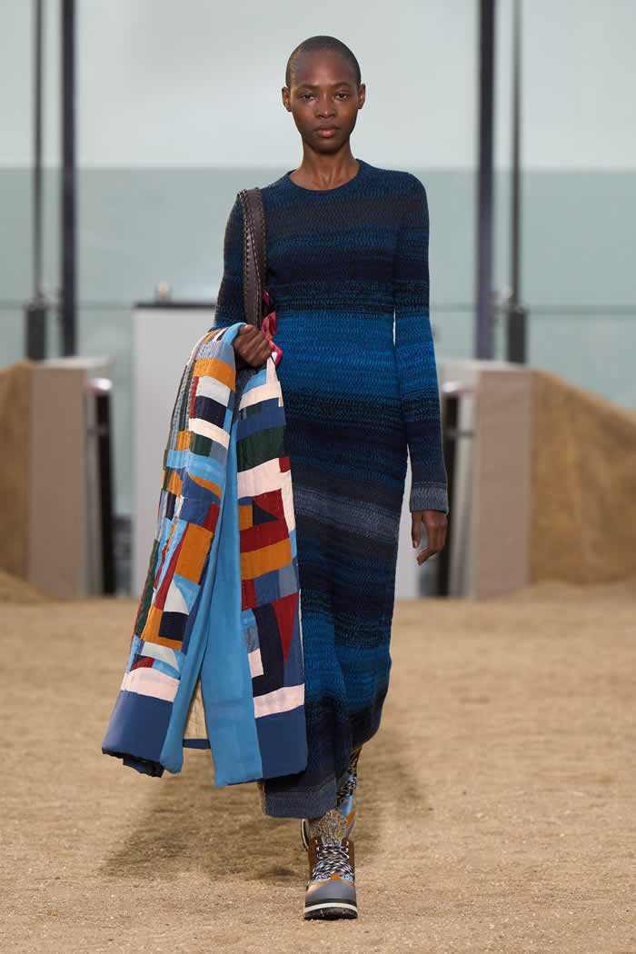 The latest is her commissioning of the African-American Gee’s Bend women quilters of Alabama. The storied artist community used Chloé deadstock scraps to fashion blankets and the gilet layered over a coat worn as the finale by Amber Valletta.