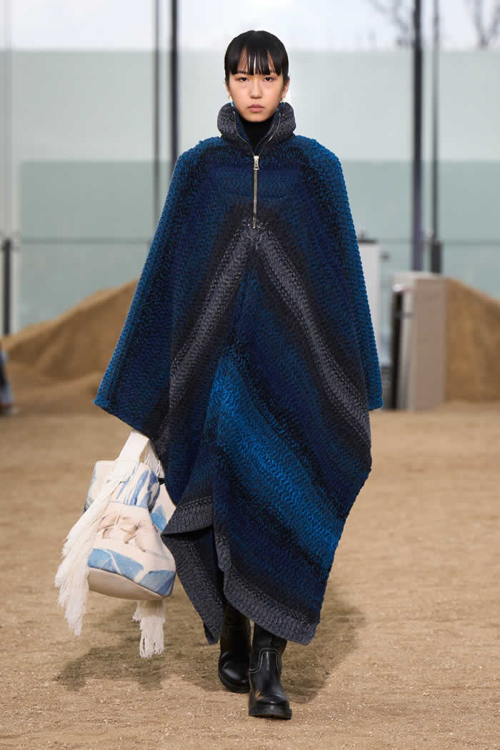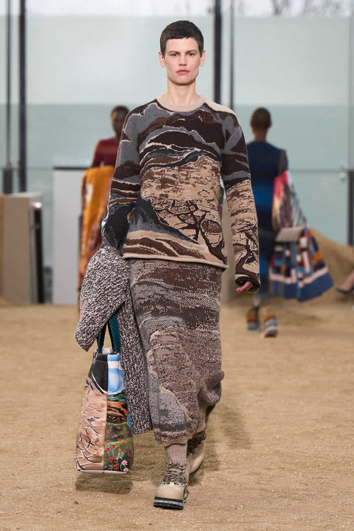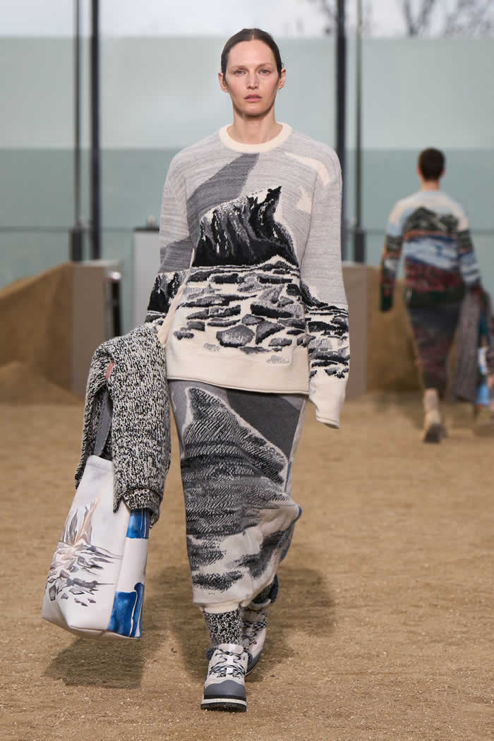 On the runway, Hearst wanted to materialize the hope that damage can be reversed. She did it with recycled cashmere knitted sweaters and skirts. On the front were intarsia images of melted glaciers, arid and burning landscapes. On the reverse: pictures of green mountain ranges, forests, and polar bears. If only humans can imagine that, she believes, we can make it happen.