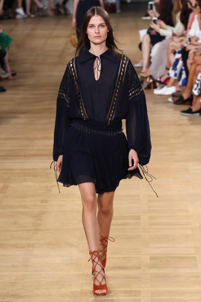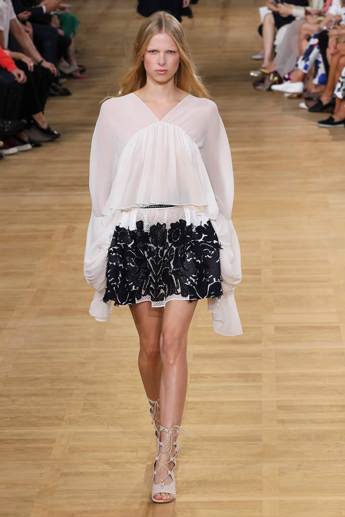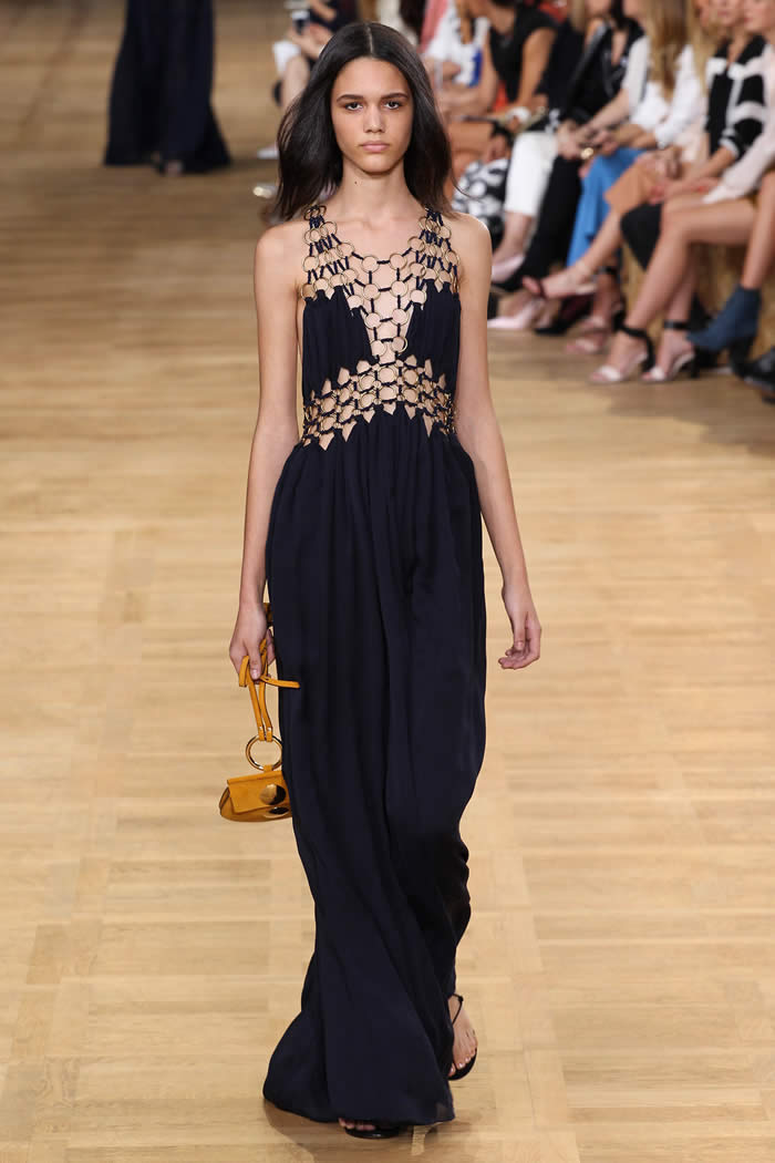 Waight Keller opened with a series of short dresses constructed out of exquisite panels of lace in white or ochre, the fabric’s fragile romanticism playing off the sportiness of the shapes. She gradually worked it into other looks, such as a deep navy skirt worn with a navy chiffon shirt, or later on, at the finale, in thigh-grazing graphic white or seafoam evening dresses with all the ease of T-shirts, but enriched by the delicacy of the lace. Between those two points, Waight Keller turned out great, wearable, no-fuss pieces (and oftentimes accessorized with Chloé’s new bag, a capacious envelope-like shoulder purse with a chain strap and a sculptural circular metal clasp).