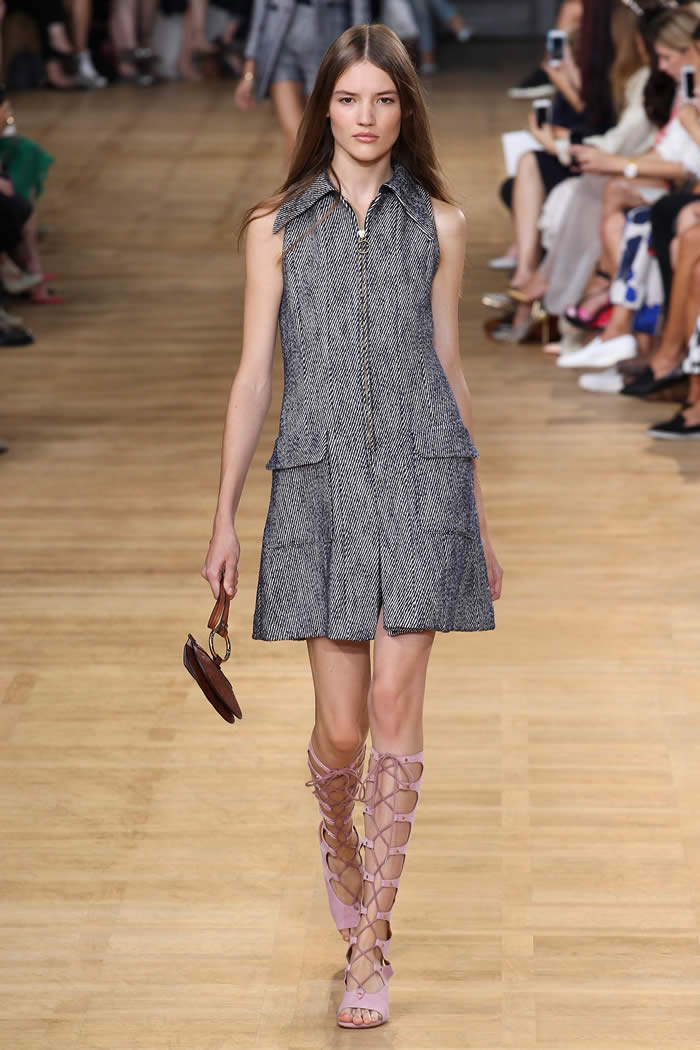 Denim, as redolent of the house as the lace, was used for an oversize shirt with straight-cut, slightly cropped pants and a soft, washed ankle-length button-through skirt, while suede appeared in a belted safari jacket or a skirt and a dress embellished with a gleaming chain-link detail threaded through their waistlines. And everything underscored that Waight Keller had achieved exactly what she had set out to do.