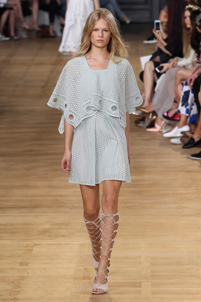 You can’t imagine the palpable sense of relief when you go backstage to chat with a designer and his or her take on the collection is this: “Everything is just meant to be clean and simple; strong, honest clothes that don’t get over-complicated.” Today’s recipient of the Keeping It Real award goes to Chloé’s Clare Waight Keller, for it is she who made that statement in the moments before curtain up, while broderie anglaise lace, crisp topstitched denim, and gentle plissée chiffon passed by in a flurry of preshow activity.