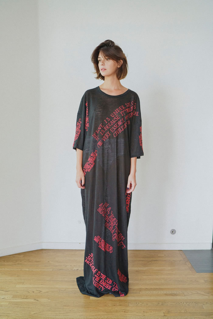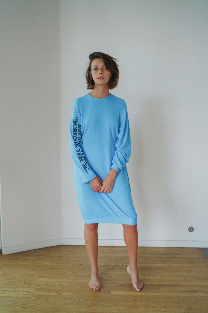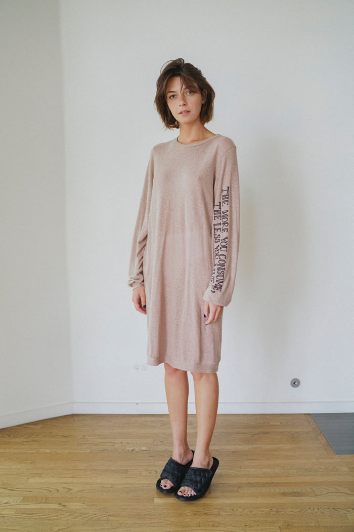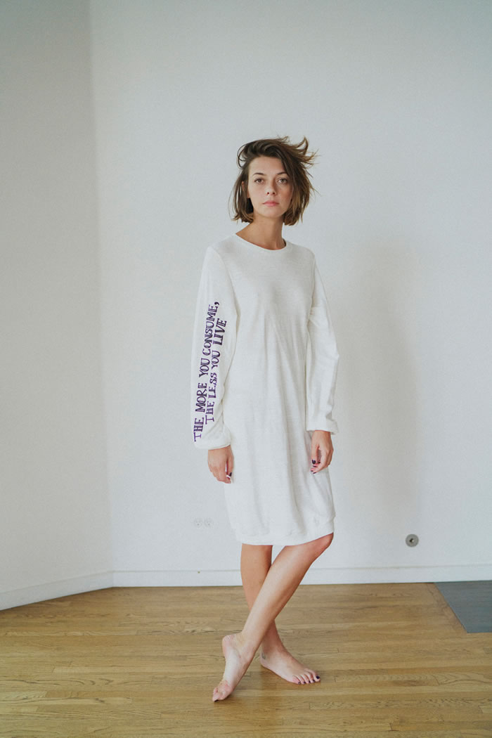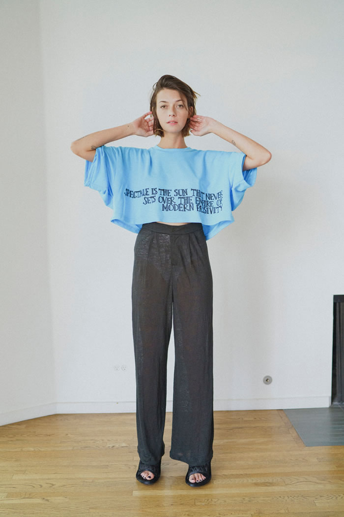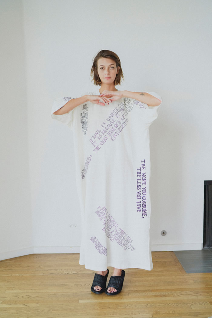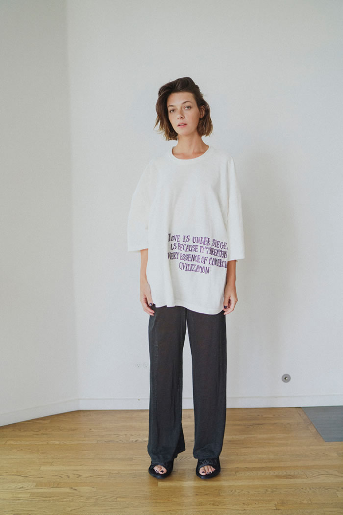 The look: The line was broken down into two sections: one a jersey and fleece assortment in deadstock fabric from 2002 that Subkoff and her designers crafted into oversize or cropped T-shirts, tank tops, and long, strappy dresses printed with sayings such as: “If love is under siege, it is because it threatens the very essence of commercial civilization.”