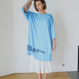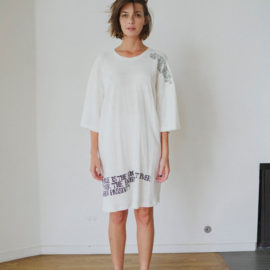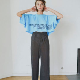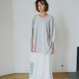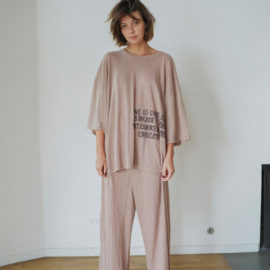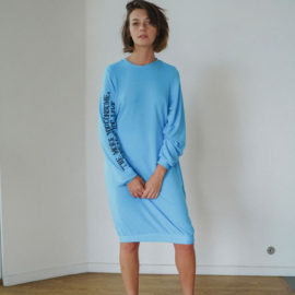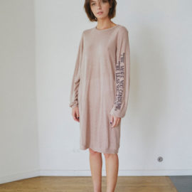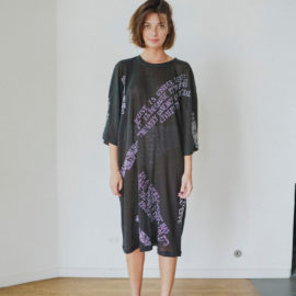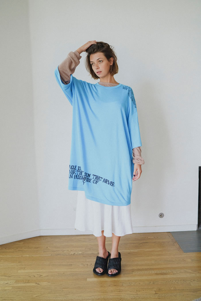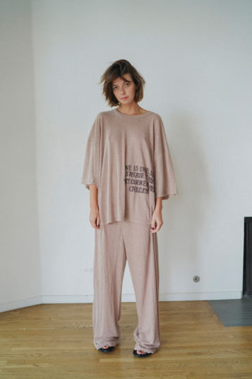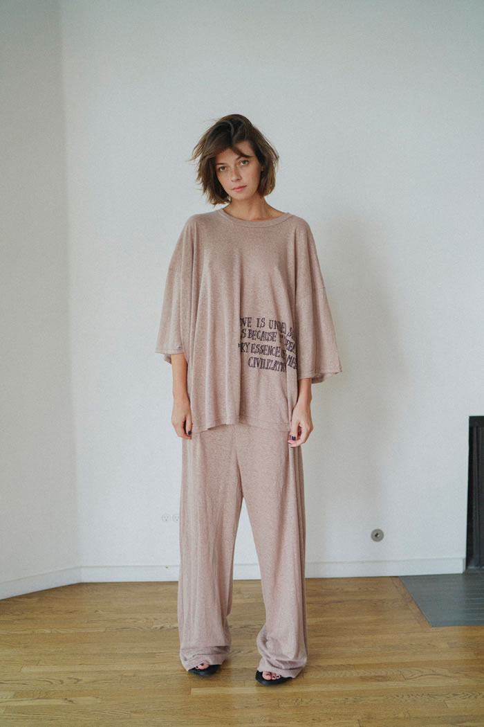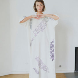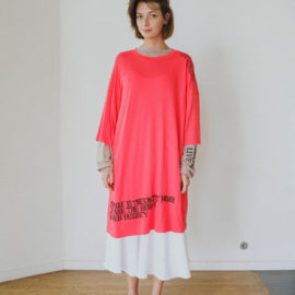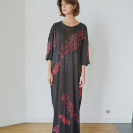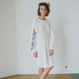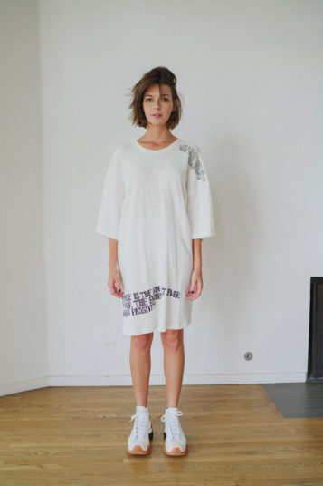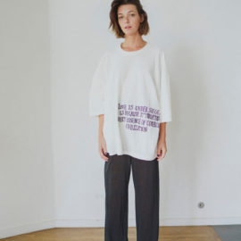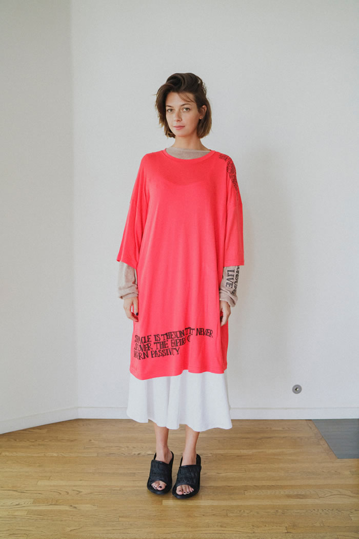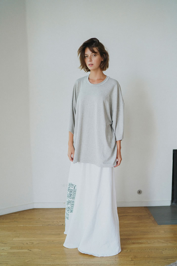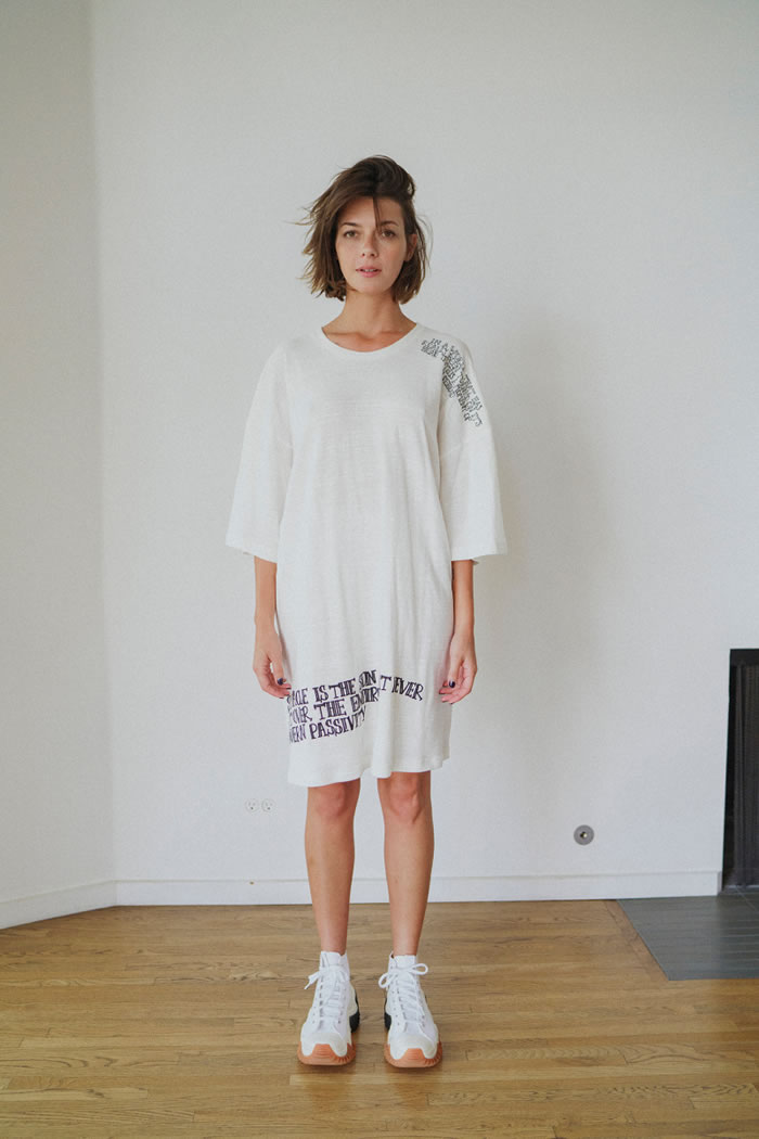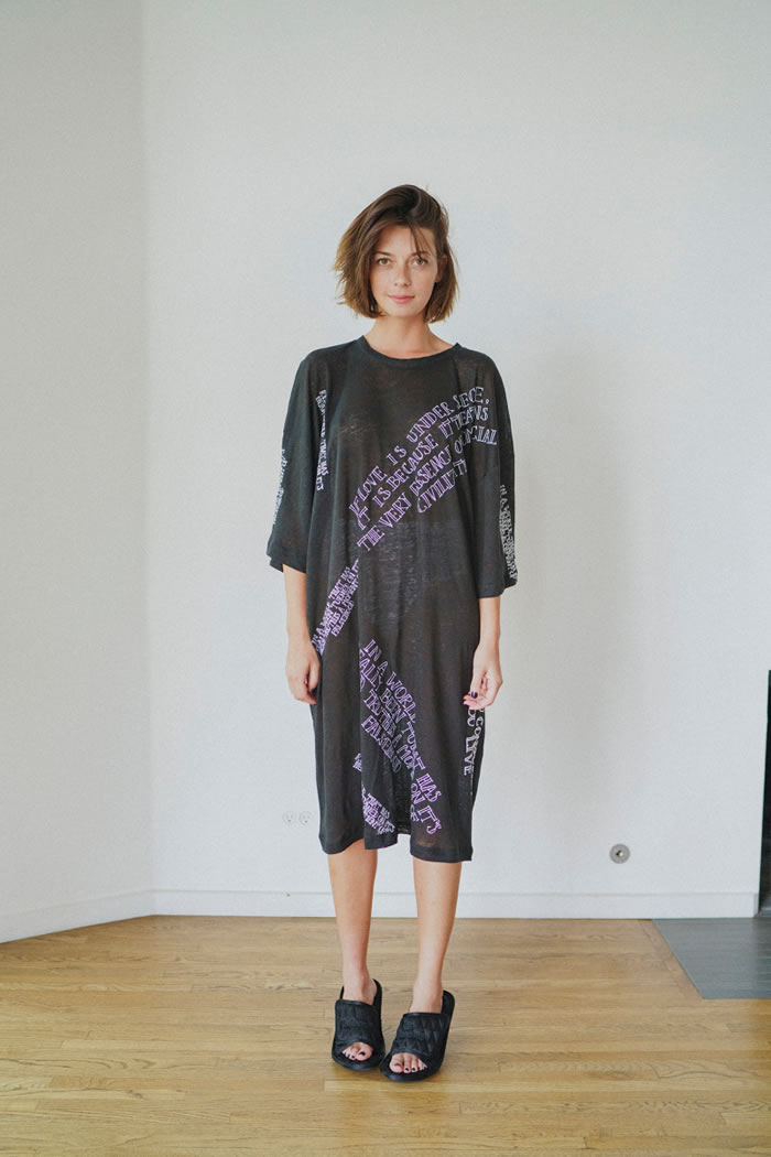The look: The line was broken down into two sections: one a jersey and fleece assortment in deadstock fabric from 2002 that Subkoff and her designers crafted into oversize or cropped T-shirts, tank tops, and long, strappy dresses printed with sayings such as: “If love is under siege, it is because it threatens the very essence of commercial civilization.”