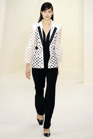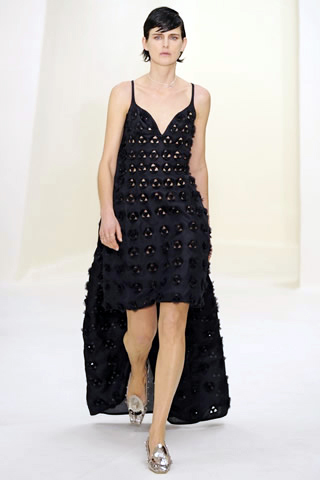 At the collection’s best, unfettered (though not always simple) charm prevailed. This swung archival Dior in relaxed takes on the Bar jacket and, more surprisingly, Courrèges/Paco Rabanne in trapeze shifts. Yet Simons eschewed his inspirations’ typical structure for softness, cutting light fabrics in clean, breezy shapes. His primary decorative motif: repetitive patterns – circle, eye, heart — embroidered onto the fabric, half of each shape cut out and often sewn with jewels for a 3-D effect.