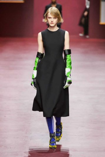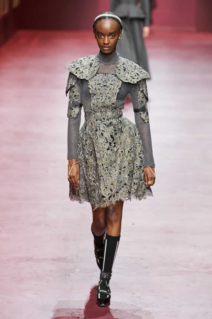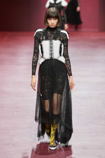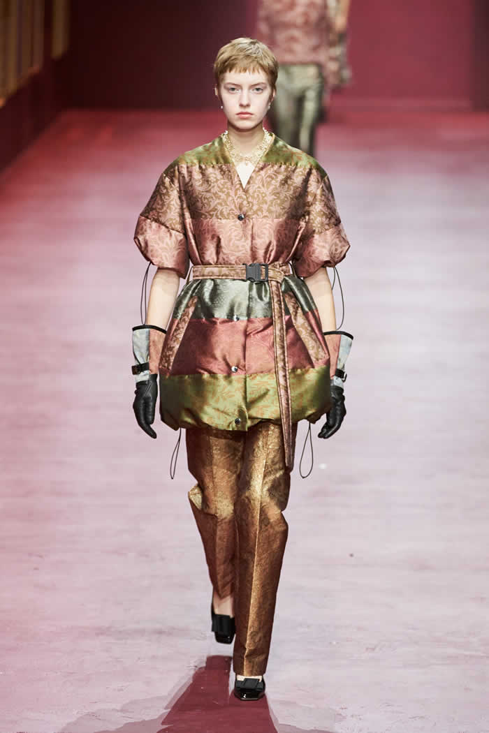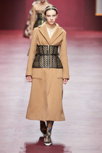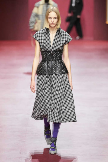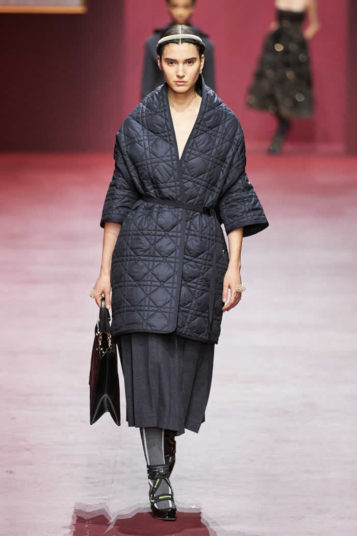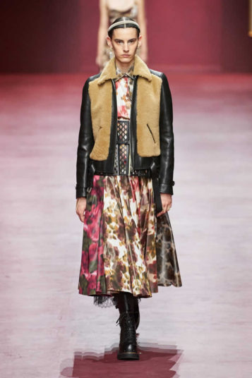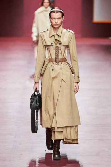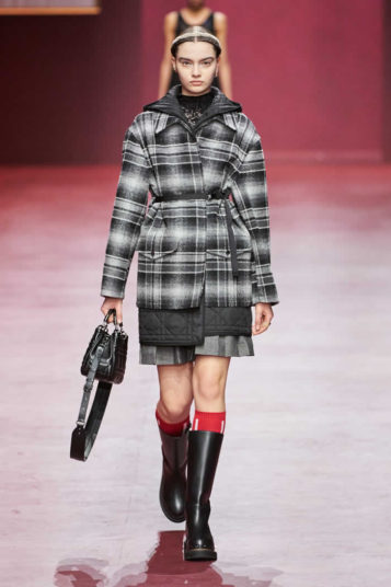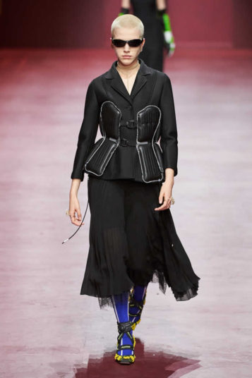That tension was the unintended consequence of the toxic twist of timing. The images of protection and hinted-at derivatives of armor which immediately surfaced to the naked eye in the collection cannot have had anything directly to do with how Maria Grazia Chiuri had planned out the spirit and execution of her fall show months ago.