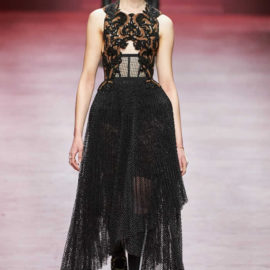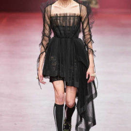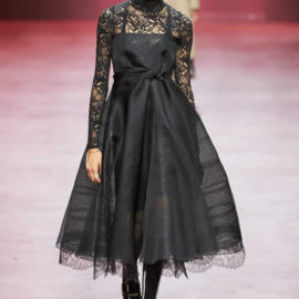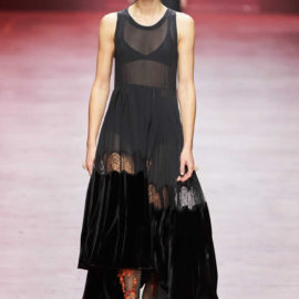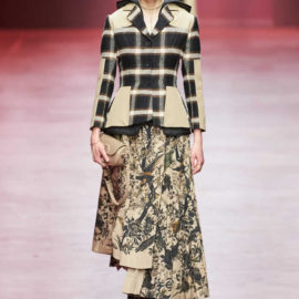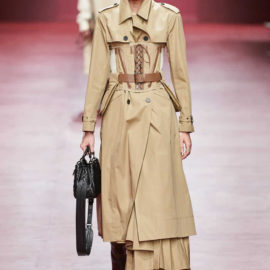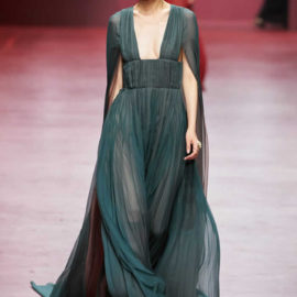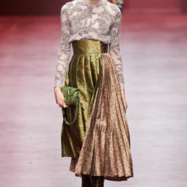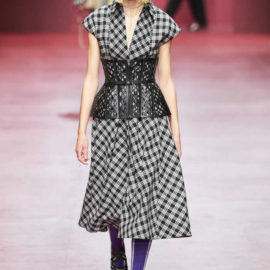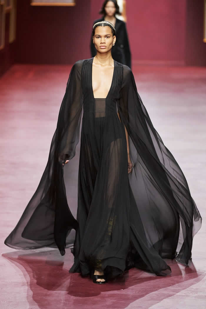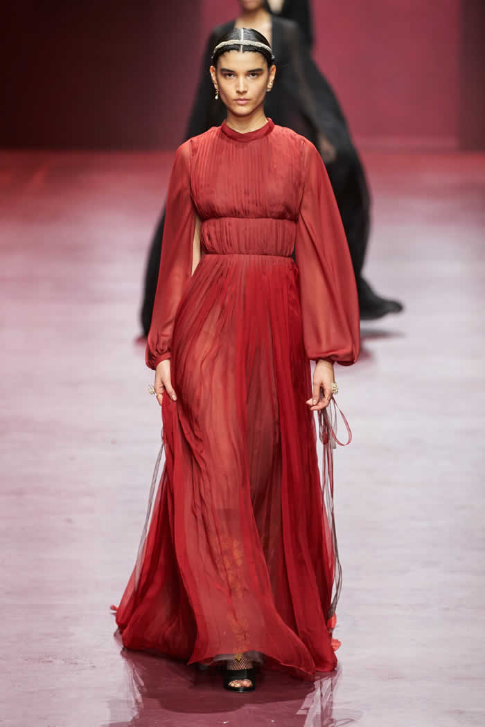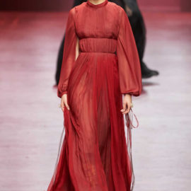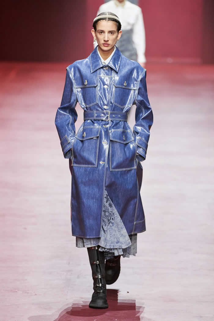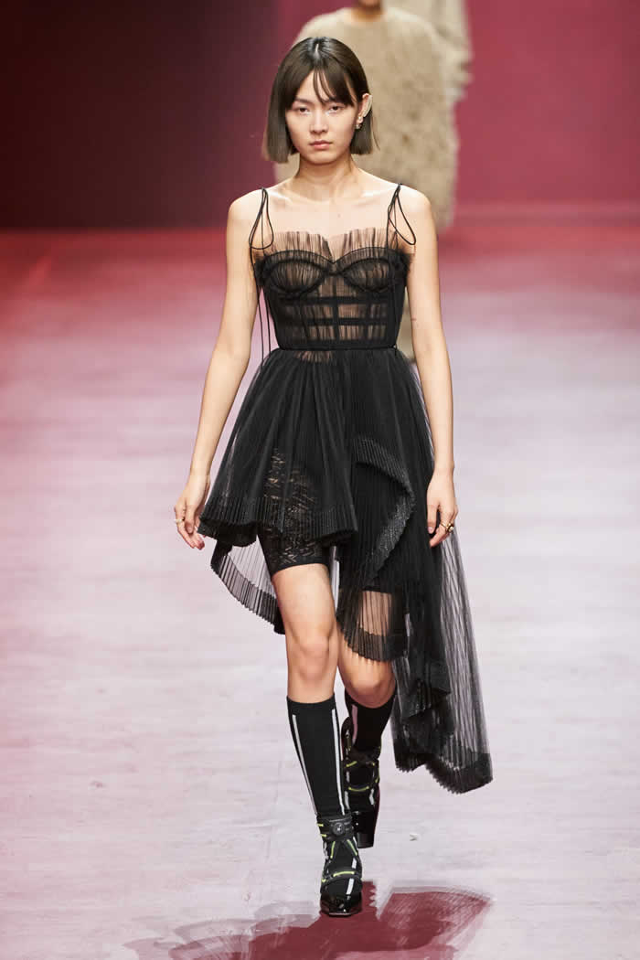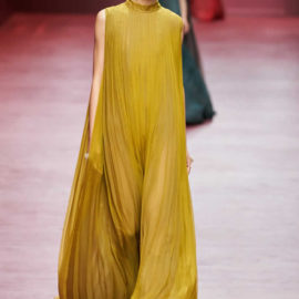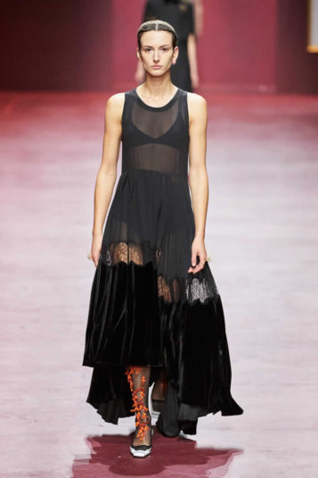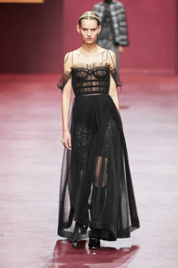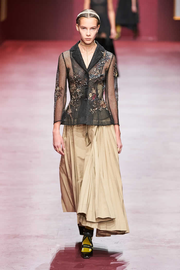 Ditto the delicate sunray pleats of another midi dress, where the intersecting strands made the skirt swirl transparently in the light. There were passages of skirt suits with asymmetric hems, substantial daywear with checked tweeds and dissected trenches to add to all this, followed up with diaphanous chiffon for the evening.