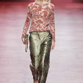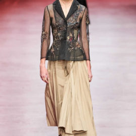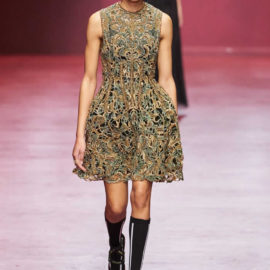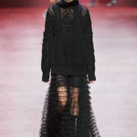 What came over best was some amazing knitwear—again due to new Italian industrial technology. Light years from a cozy sweater, a beautifully fine cobwebby lace bodice on a fluffy tiered skirt was entirely knitted by a computerized machine.