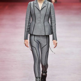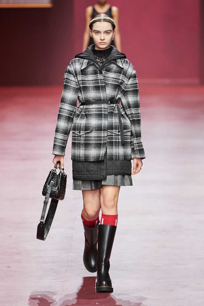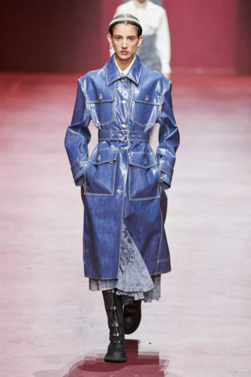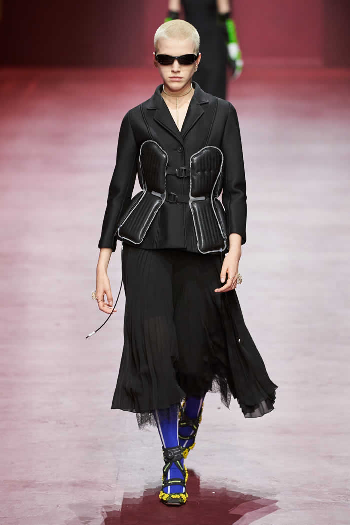 Look 2 in the show was an inside-out demo of how a Bar jacket (with the form of its traditional 1950s inner padding exposed) had the potential to become a 2022 climate-sensitive garment. Cool when the wearer feels hot, and vice versa. This, and other pieces in the show (in which the technology was not so obvious) were the result of a collaboration with D-Air Lab, a technical specialist Italian company that makes safe, functional clothing and materials for sports, industrial, and other non-fashion purposes.
