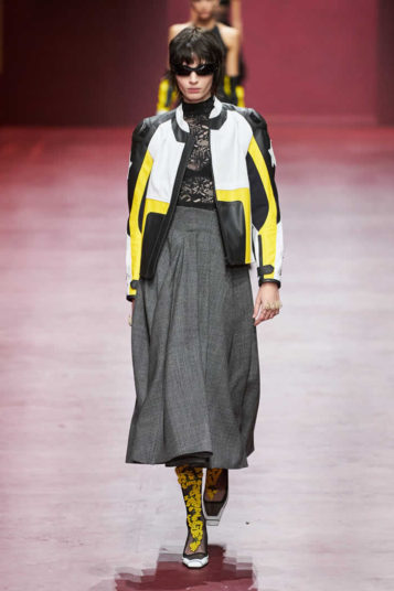 Chiuri liked the challenge of finding co-habiting synergies between Dior’s sober gray suiting and feminine chiffon dresses and technical biker jackets, football shoulder pads, and protective racing gloves. That went right down to the shoes—Roger Vivier’s original ’50s Louis heels for Dior, but with technical “anti-twist” ankle straps, and vividly collaged beading.
