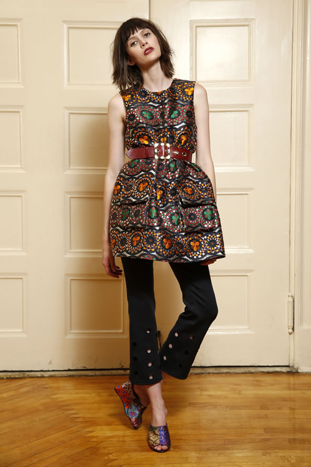 Rowley’s clothes, which took cues from the building’s ornate decor and architecture, featured printed brocades, embroidered lace and French woven cotton which the designer playfully referred to as a “drug rug”rendered in a cute pink skirt suit. The lineup’s prints and textures, including florals, paisleys and graphic knits, clashed in an artfully chic fashion. “I wanted the collection to work together with the venue you sort of can’t tell what’s inspiring what,” Cynthia Rowley said.