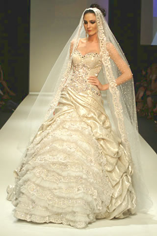 Source: Draped satin over bucketful of stones encrusted laces, folded faille and satin duchess with extremely crystallized bodice, massive skirt with long train fabrics sashayed down the runway.