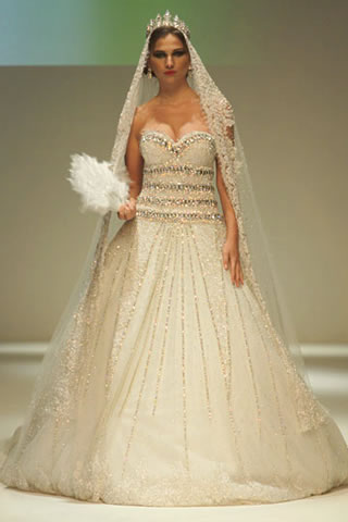 Source: Elaborate designs embroidered with excessive Swarovski stones and brilliants, The lavish display of iridescent crystals with over whimsical touches would have made any Empress turned green with envy.