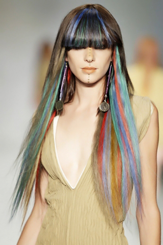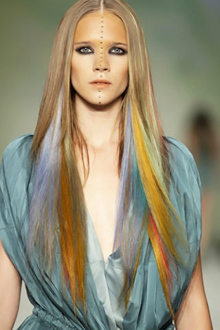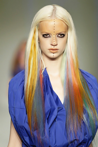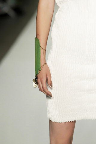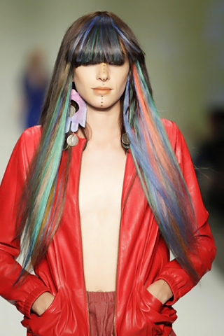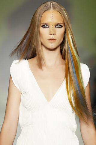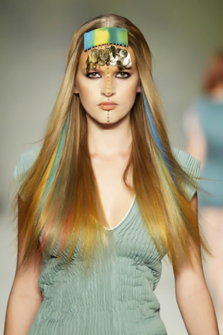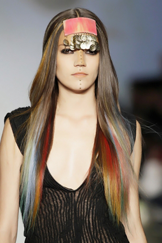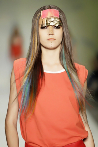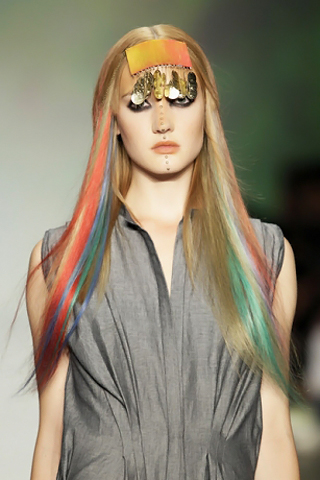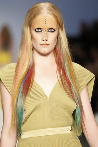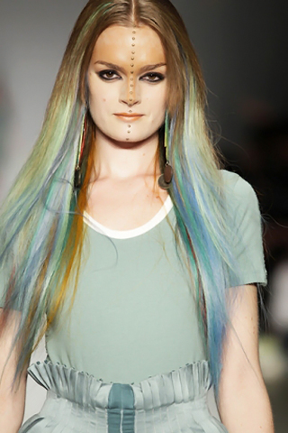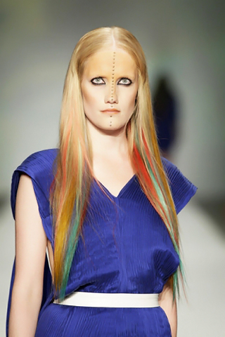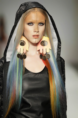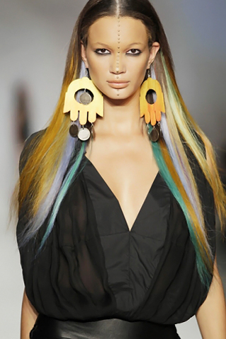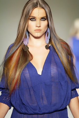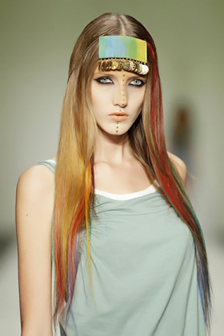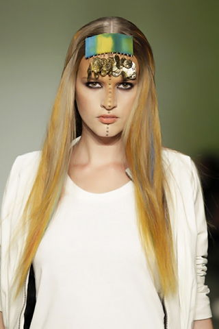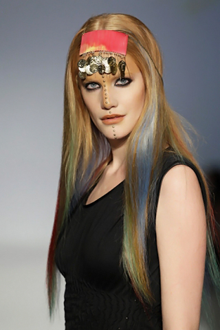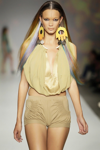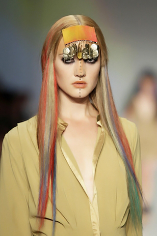 Less than before the fact that Daryl lives now in Shanghai influenced the collection. Yet the show did have a foreign touch. The models had special make-up with vertical dots, their hair was green, red and blue colored. The girls wore (gypsy) accessories (headbands, bracelets and earrings) with coins and walked on colorful, leather – designed by Daryl – sandals.