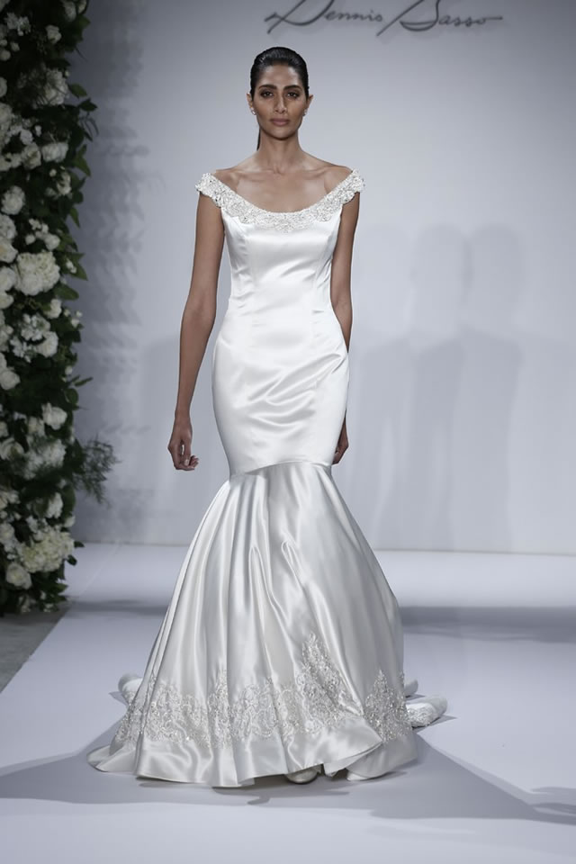 Dennis Basso described his collection as targeting a woman with European taste. Perhaps so, but that vision translated into a range of classic shapes: mermaids, big princess gowns and A lines, including one with a long-sleeve illusion bodice and chiffon skirt. He worked both sleek and voluminous silhouettes with embroidery, crystal beading and sheer insets.