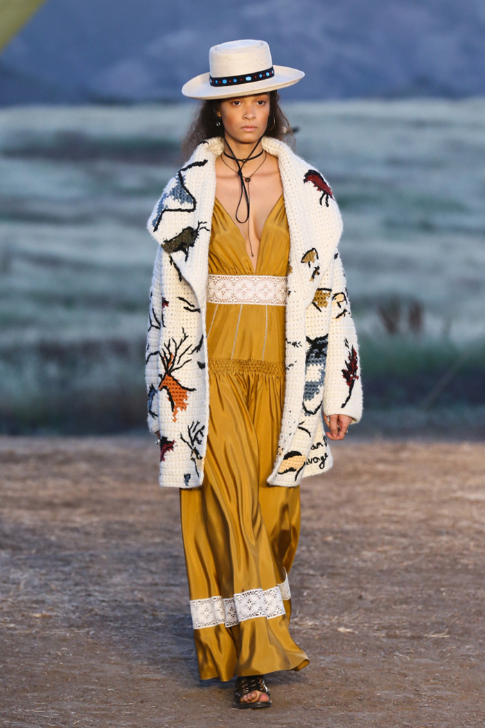 Chiuri let the location, the desert landscape and natural California elements, inspire the collection, which was flush with handcrafted details, artisanal touches fur, shearling, feathers, fringe — and rich desert colors. She obliged house heritage by finding a concrete California connection to Monsieur Dior, who visited San Francisco in 1947, and a more tenuous tie to the look she wanted to pursue: Dior’s 1951 Ovale line included prints inspired by the primitive etchings in the Lascaux cave in Southwestern France, which Chiuri reworked for cruise. Sauvage referenced the famous Dior perfume Eau Sauvage.