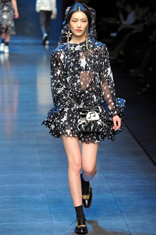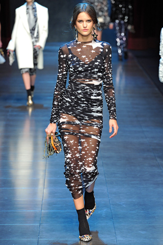 Dolce & Gabbana’s latest collection 2011 at Milan Fashion Week was all about stars. The latest collection 2011 seemed like a portion of Milky Way Galaxy, with twinkling stars in all sizes from pin-got to huge, in prints, sequins, crystals, fur, giant dangling earrings and necklaces. The latest collection 2011 by D&G focused on femininity with alluring skintight dresses in black and white. Besides, there were shots of color, a crystal-on-gold sequined dazzler and a pair of chiffon gowns, one pink, and one blue covered in black stars. Dolce & Gabbana Fall 2011 latest collection from Milan Fashion Week Fall 2011-2012for 2011 fashion.