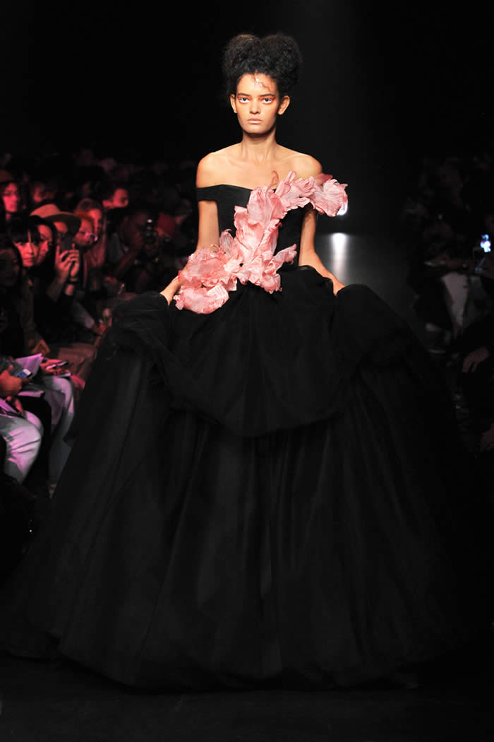 A dramatic, floor-grazing black ballgown with pink flowers draped across the bodice opened the Dresscamp show, setting the stage for Toshikazu Iwaya’s romantic yet uneven turn for spring. Iwaya’s models wore frothy dresses and skirt sets with something of a Victorian vibe to them. But in this mixed bag of a show, there were both hits and misses.