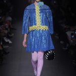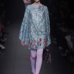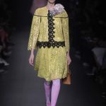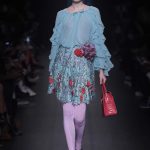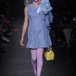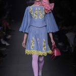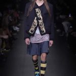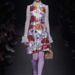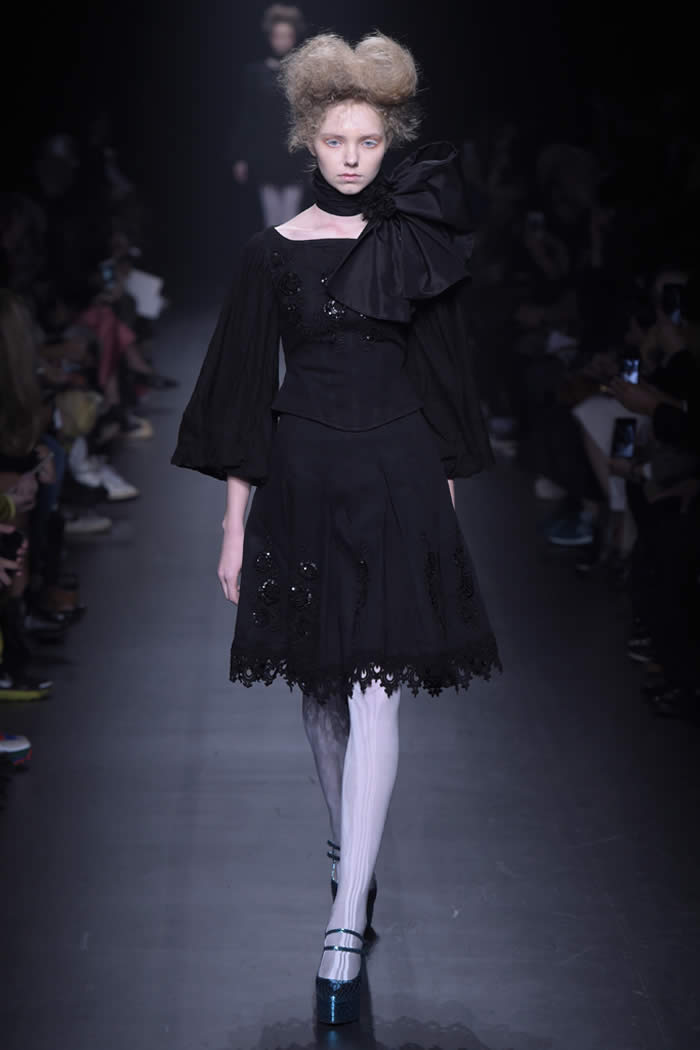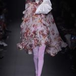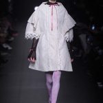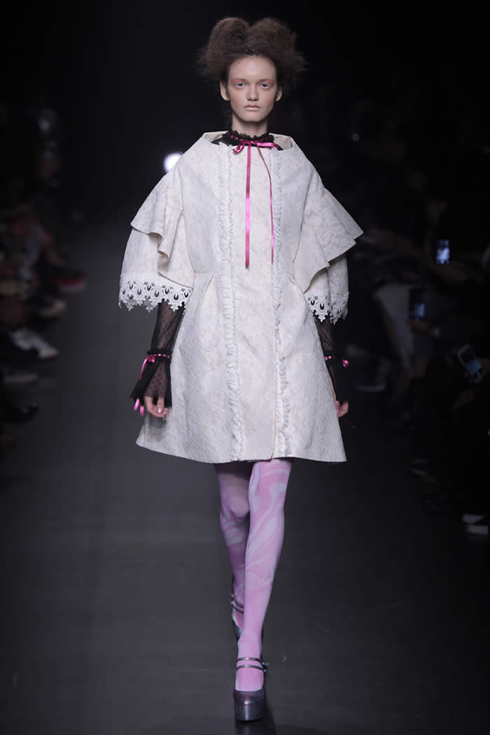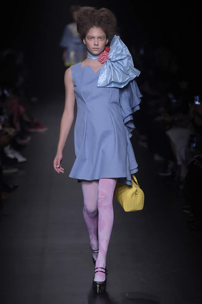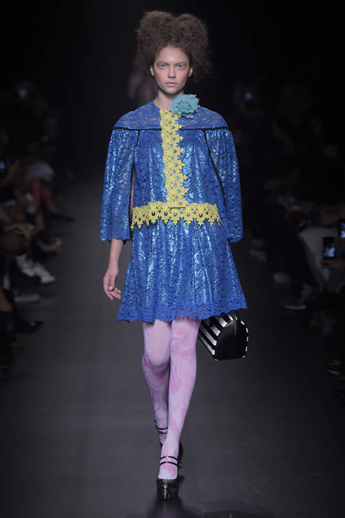 On the positive side, bold, almost psychedelic color combos dominated the lineup as in a lacy, turquoise dress worn over purple swirled tights. Sparkly petticoats peeked out from the hemlines of full dresses and skirts done in bright floral prints. One arresting ivory number featured lace-trimmed, ruffled sleeves. A range of small structured handbags made in partnership with Japanese firm Samantha Thavasa was also a success, in particular the versions in stripes and abstract paint splotches.