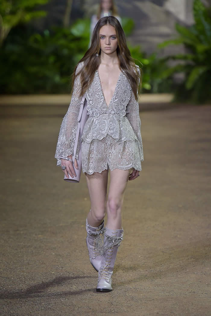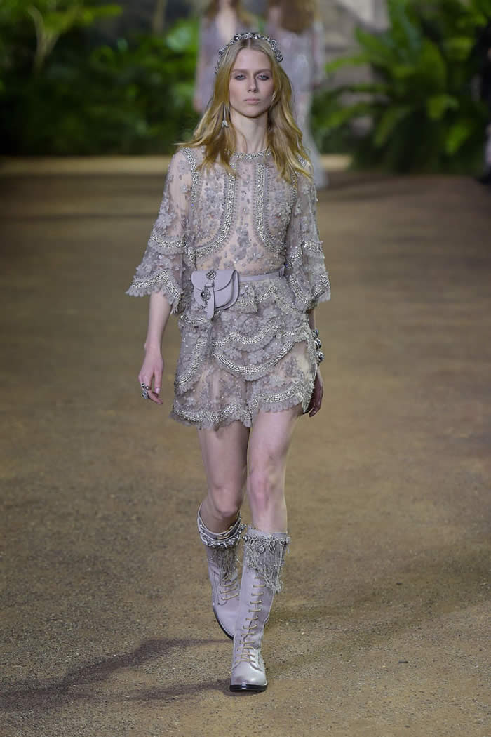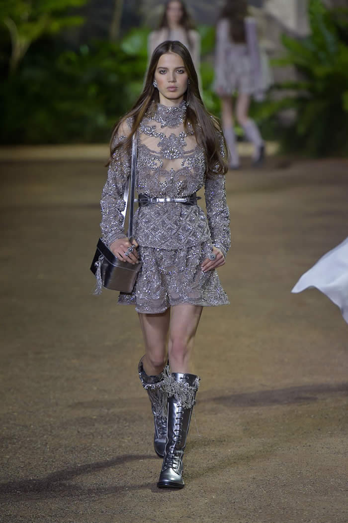 They were lovely, and exemplified Elie Saab’s knack for veiling the body with dense, yet delicate ornamentation. Forgetting short interludes of mother-of-the-bride blues, this show cast a spell with its pale shades of blush, clotted cream and antique silver.