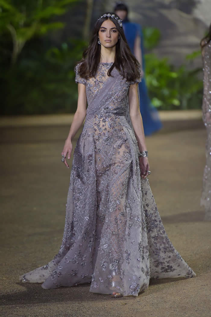 The Elie Saab woman is probably unaccustomed to walking on soil, and in flat explorer boots, no less. So maybe it was apropos that a few models in his spring couture show tripped on the earthen runway.