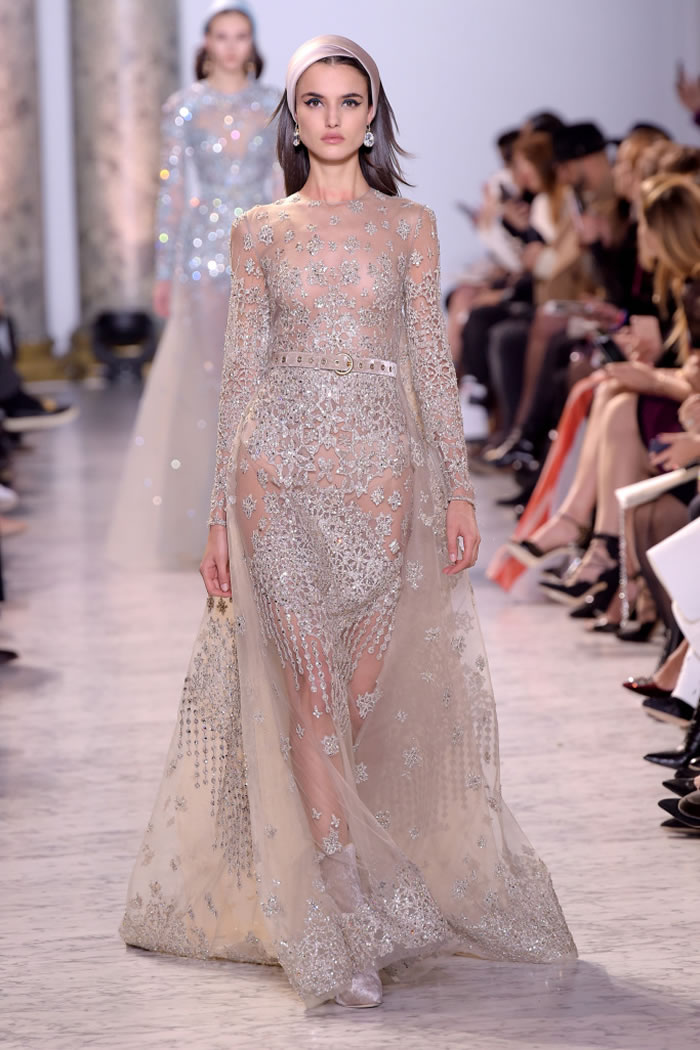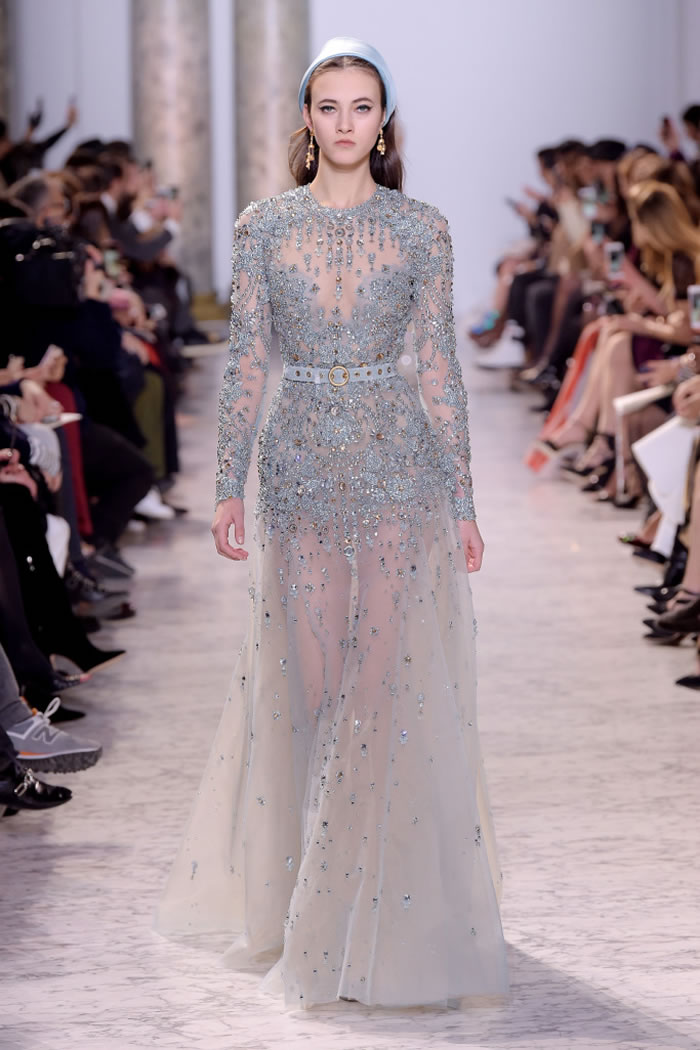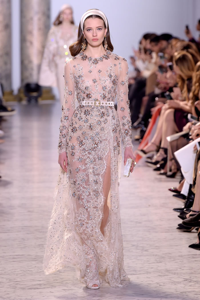 Distracting from the subzero temperatures outside, Elie Saab conjured the bygone glamour of the golden age of Egyptian cinema, with the designer citing actress Faten Hamama in a party scene from film “I Don’t Sleep,” starring opposite Omar Sharif among inspirations.