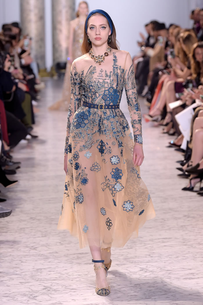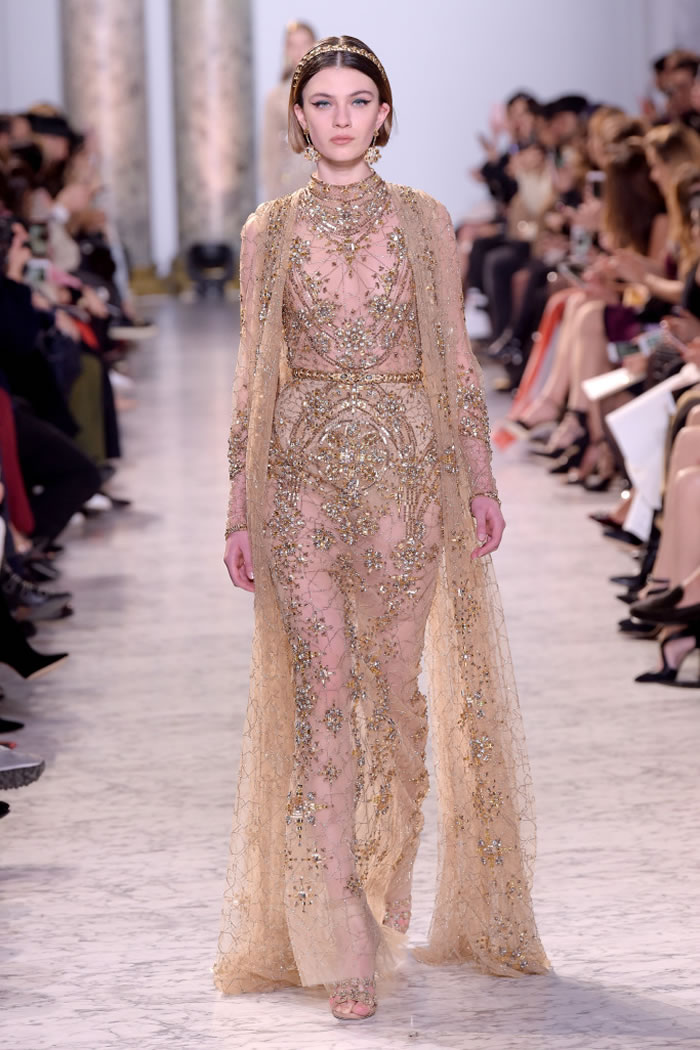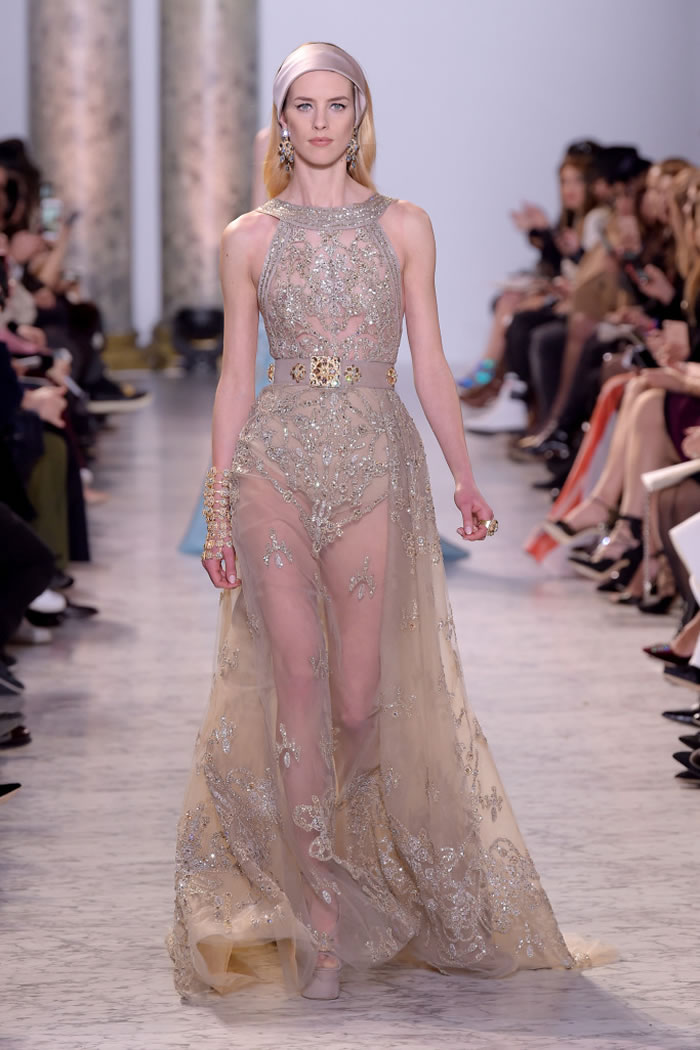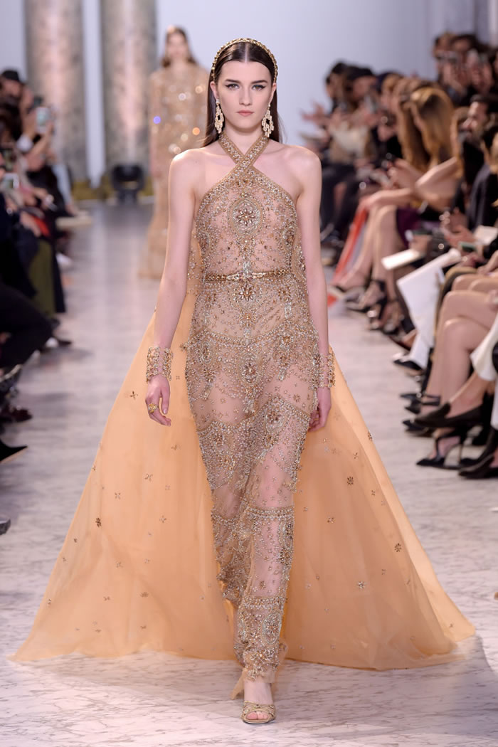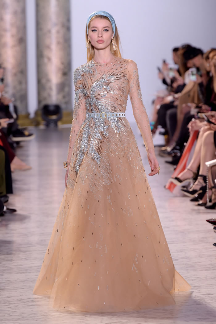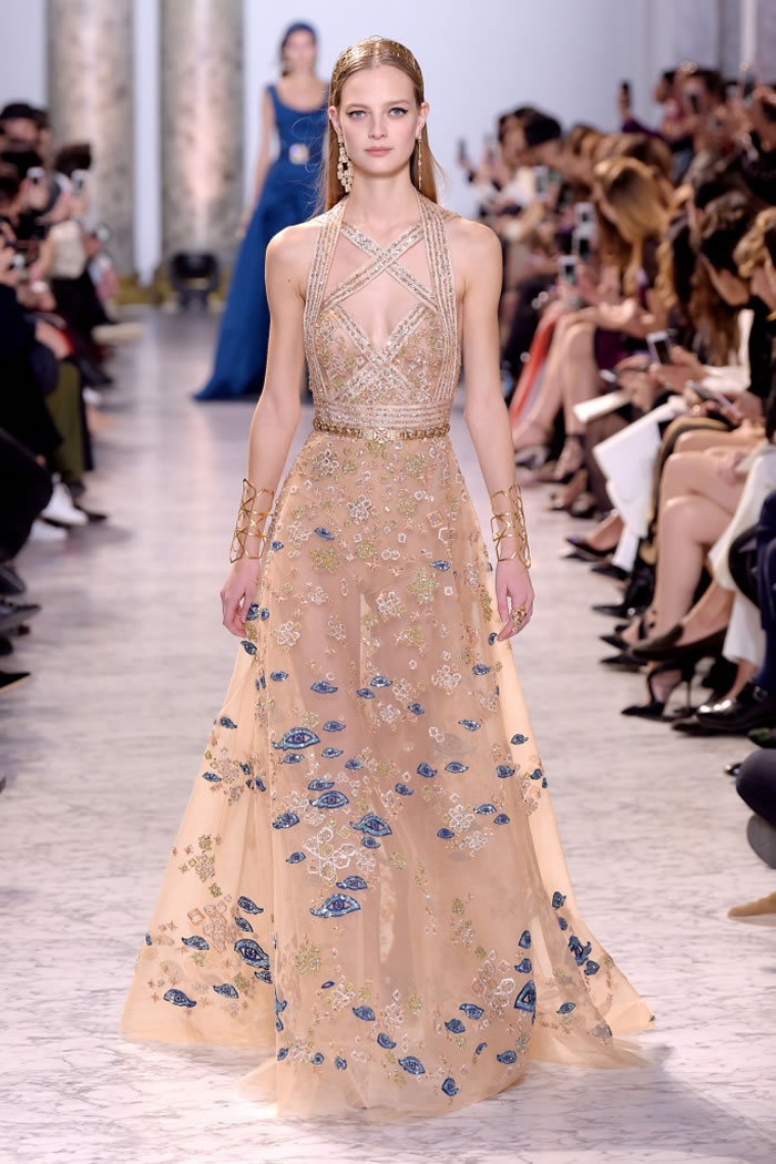 The more elaborate gowns in his sparkling, red carpet-oriented collection included a sheer tulle gown with hazy pale blue and silver placement embroidery evoking boats on the river Nile and palm trees, with the silvery fronds of one tree peeking over the sweetheart neckline. Other highlights included a long-sleeved gown in tan satin peppered with deep blue “evil eye” motifs.