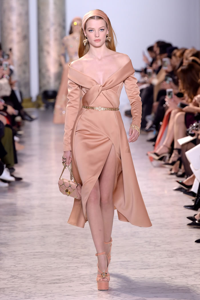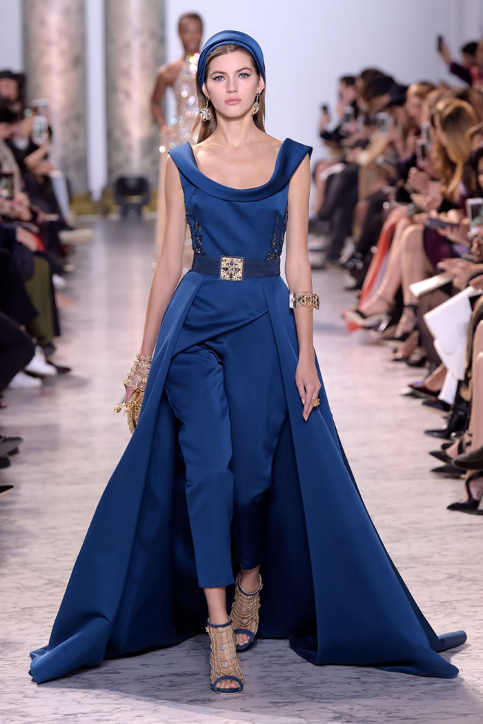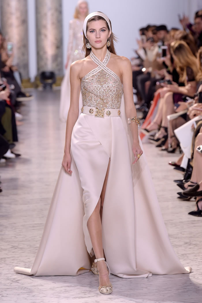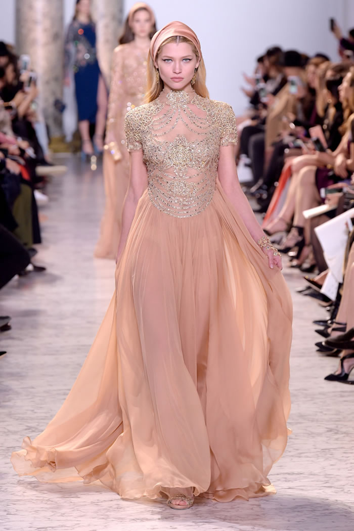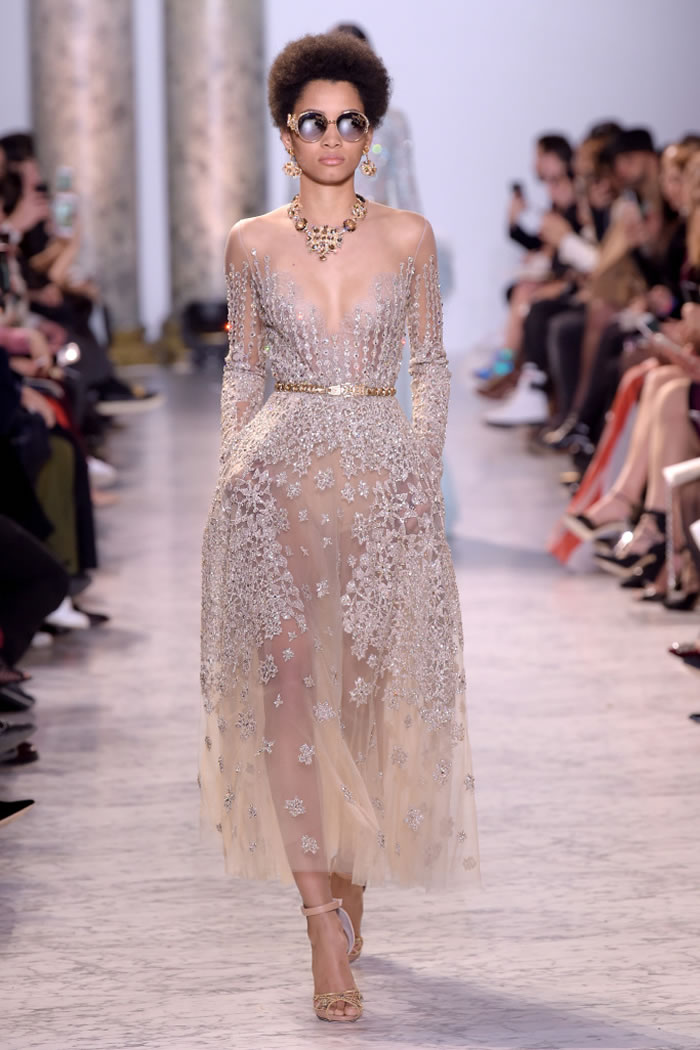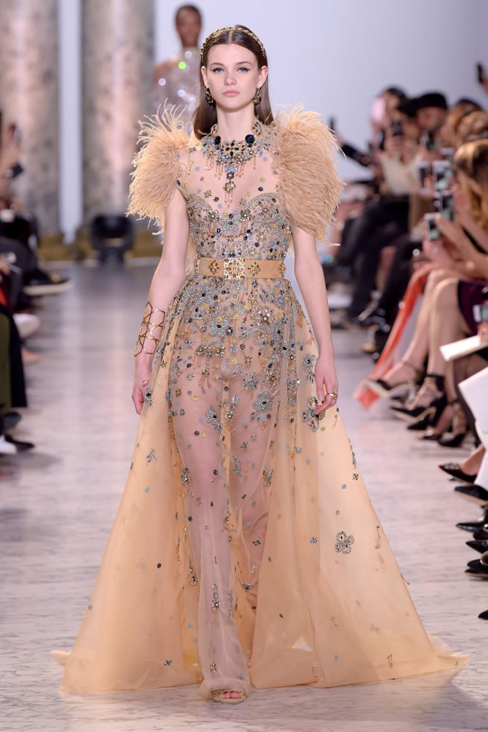 The more elaborate gowns in his sparkling, red carpet-oriented collection included a sheer tulle gown with hazy pale blue and silver placement embroidery evoking boats on the river Nile and palm trees, with the silvery fronds of one tree peeking over the sweetheart neckline. Other highlights included a long-sleeved gown in tan satin peppered with deep blue “evil eye” motifs.