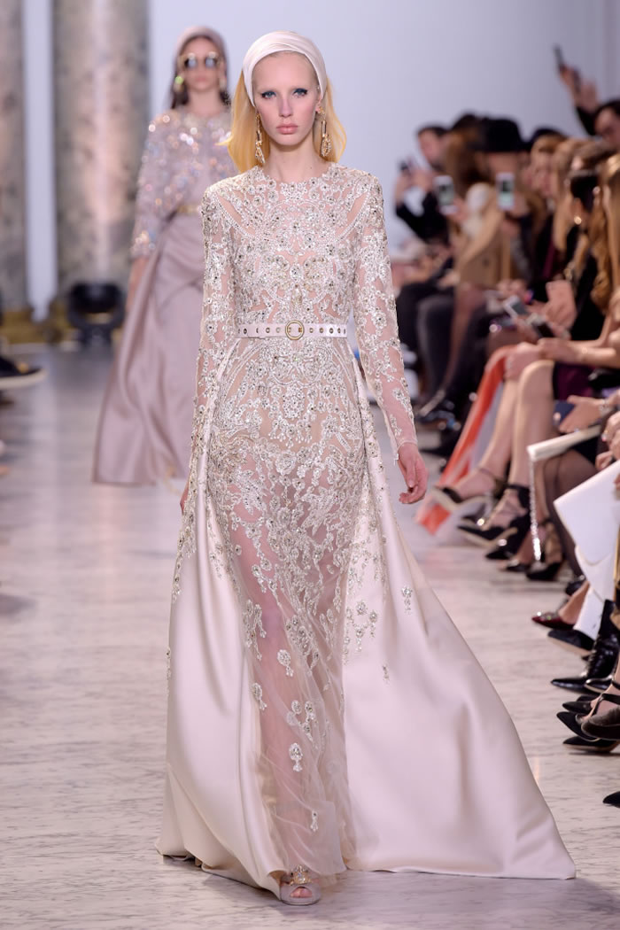 The more elaborate gowns in his sparkling, red carpet-oriented collection included a sheer tulle gown with hazy pale blue and silver placement embroidery evoking boats on the river Nile and palm trees, with the silvery fronds of one tree peeking over the sweetheart neckline. Other highlights included a long-sleeved gown in tan satin peppered with deep blue “evil eye” motifs.