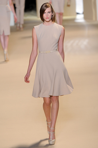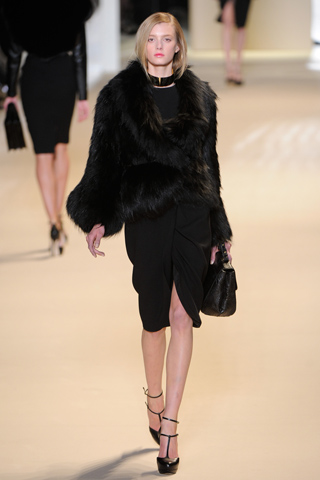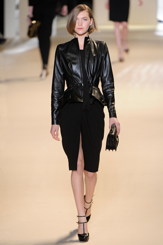 The daywear was brimming with skirts suits, peplumed jackets and pencil skirts, all much more sober than usual. It was cut clean and discreet with spare details such as single inverted pleats on the front of a sheath dress. Elie Saab further enhanced the daywear drama with fur shrugs and leather jackets.