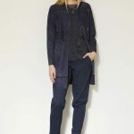 Paired with pointelle knits and micro floral-printed blouses, Tahari’s cool cropped bombers and a hooded capes oozed a sporty-chic appeal.