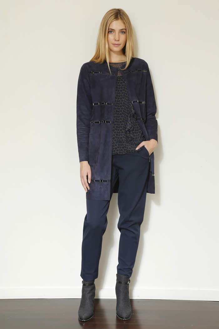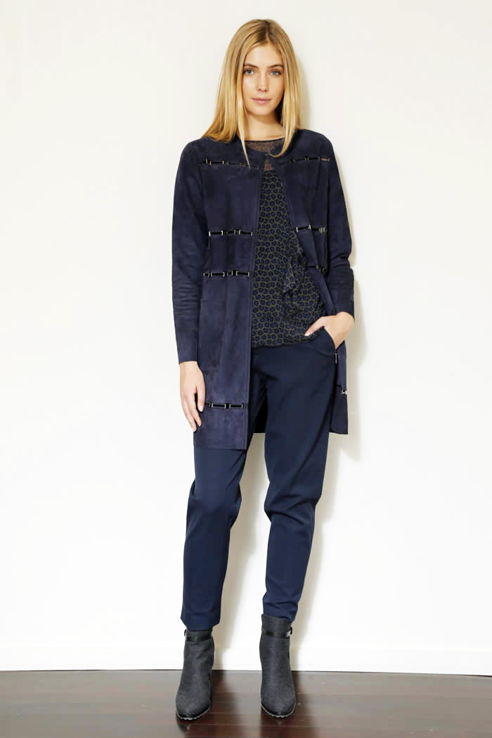 Elie Tahari’s signature tailored sportswear items, such as double-faced wool coats and lightweight suede skirts, came in charcoal and slate blue, modernized for the season with cutout detailing and silver hardware.